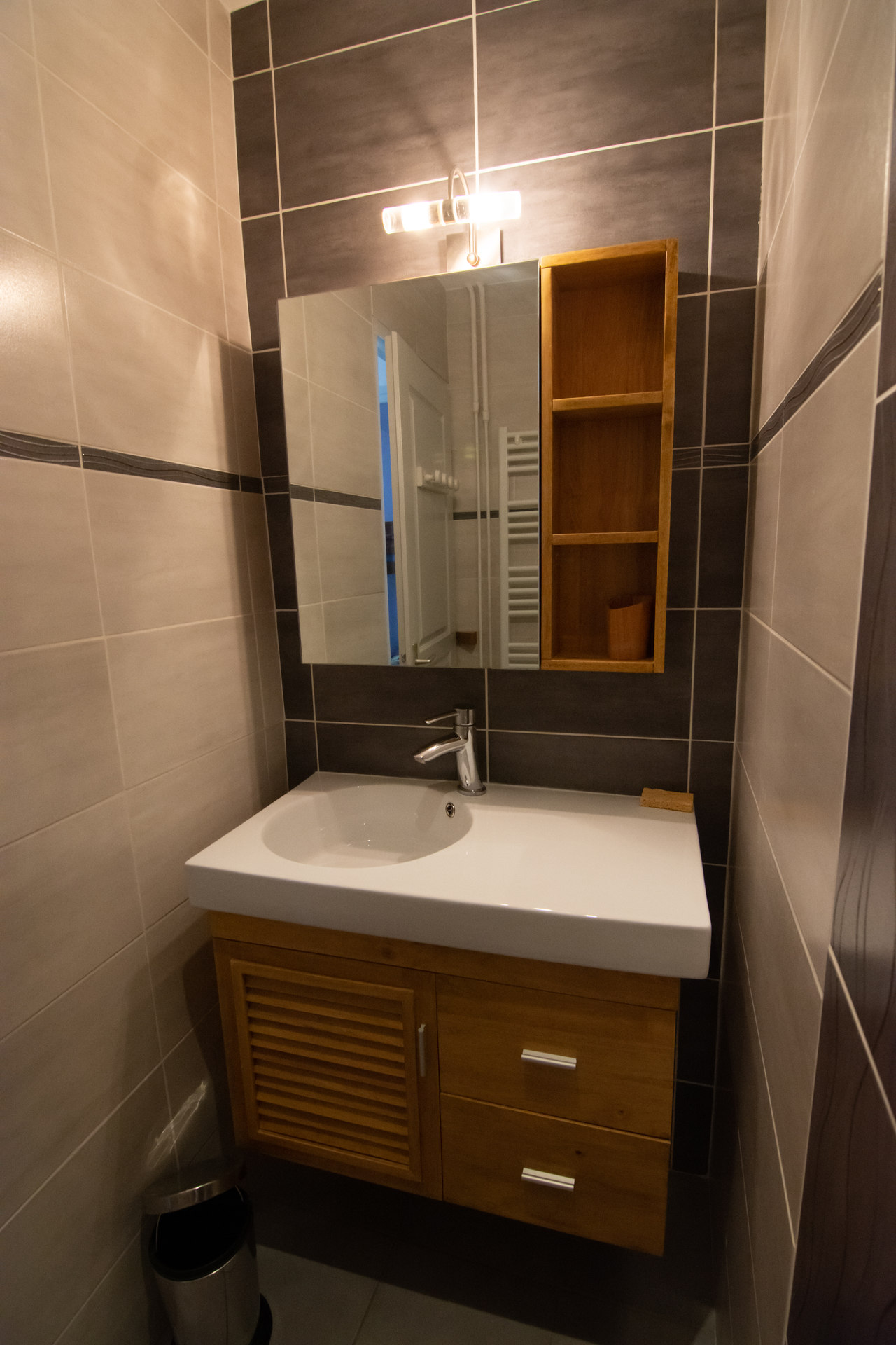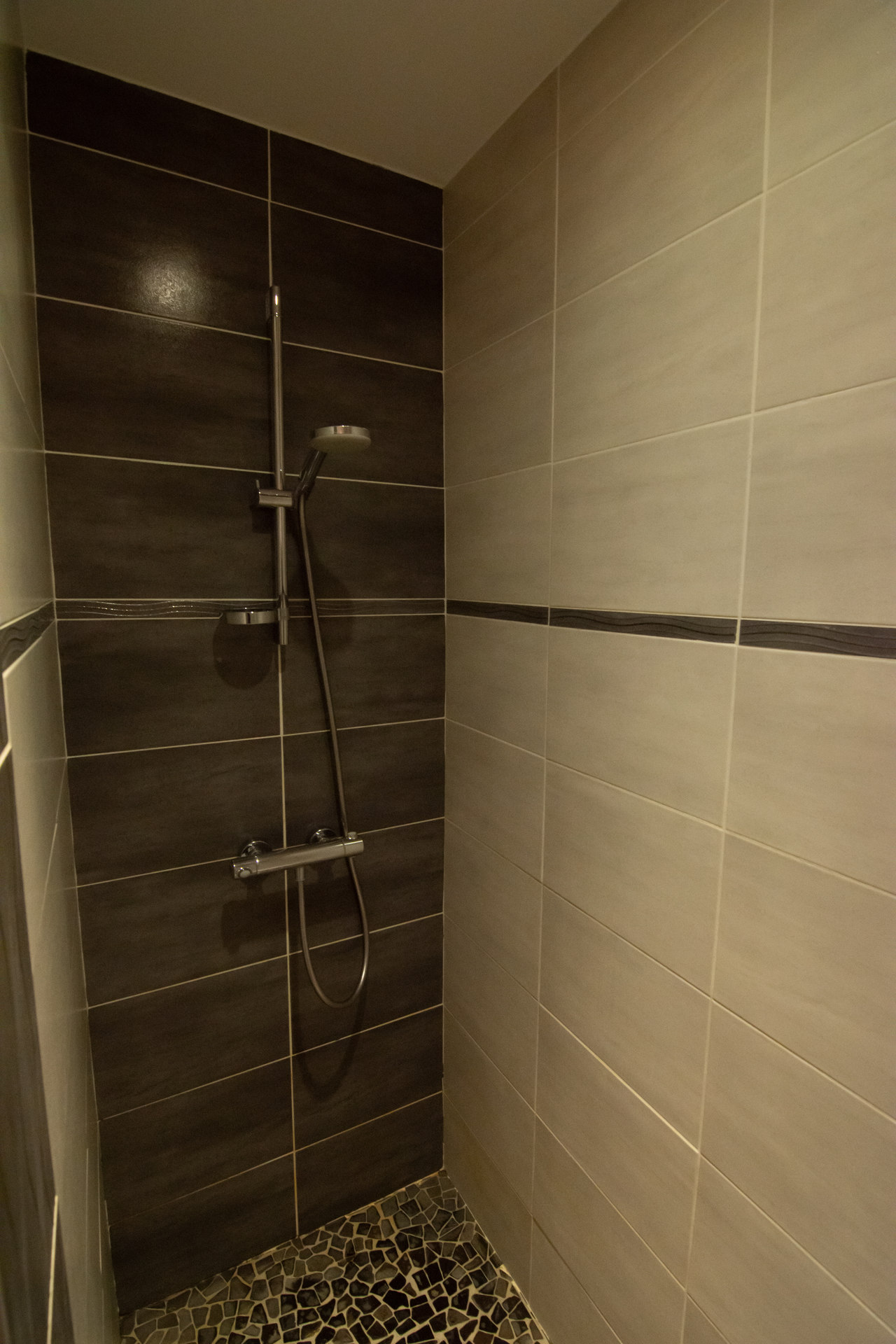 Salle d'eau : douche, seche-cheveux et seche-serviettes.