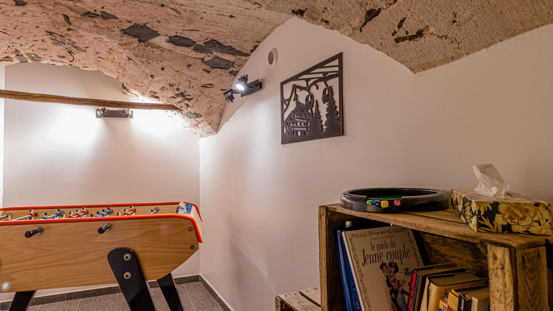 Cave voutee en pierre (Niv -1) : poufs, television, baby-foot, jeux, livres, enceinte Bluetooth.