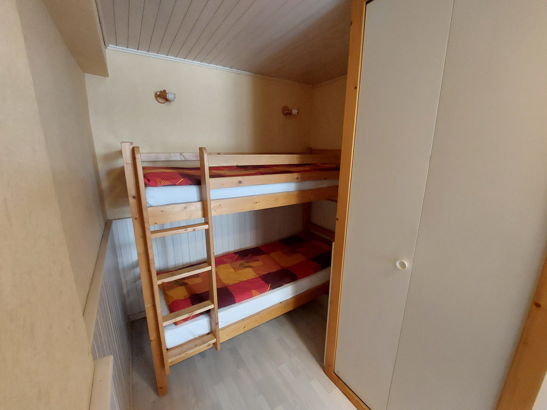 Chambre (14m2) : 1 lit double (140cm) + 2 lits simples superposes + un lavabo et une douche.