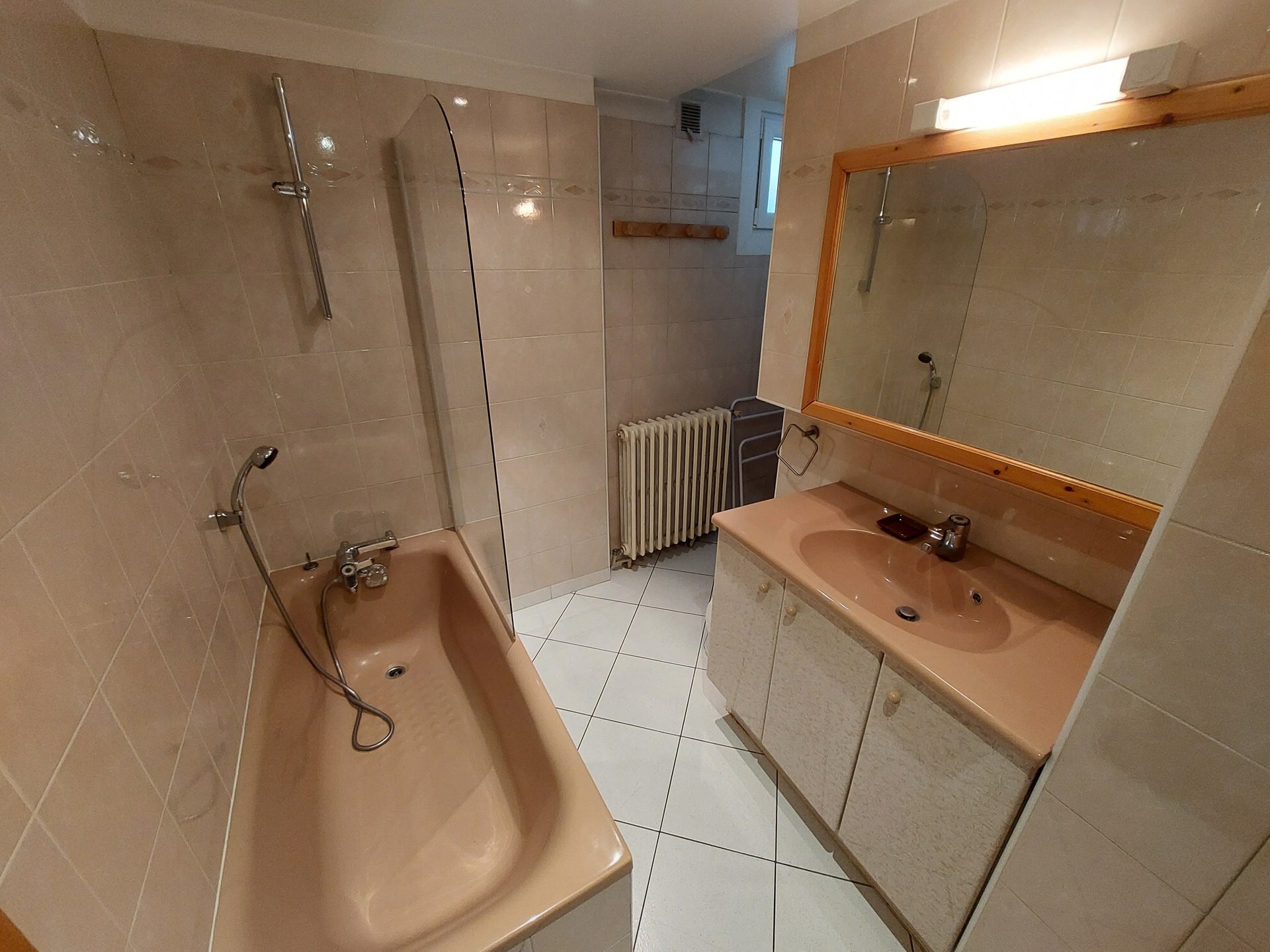 Salle de bains (Niv 0/ 7m2) : lavabo, baignoire et douche. WC independant