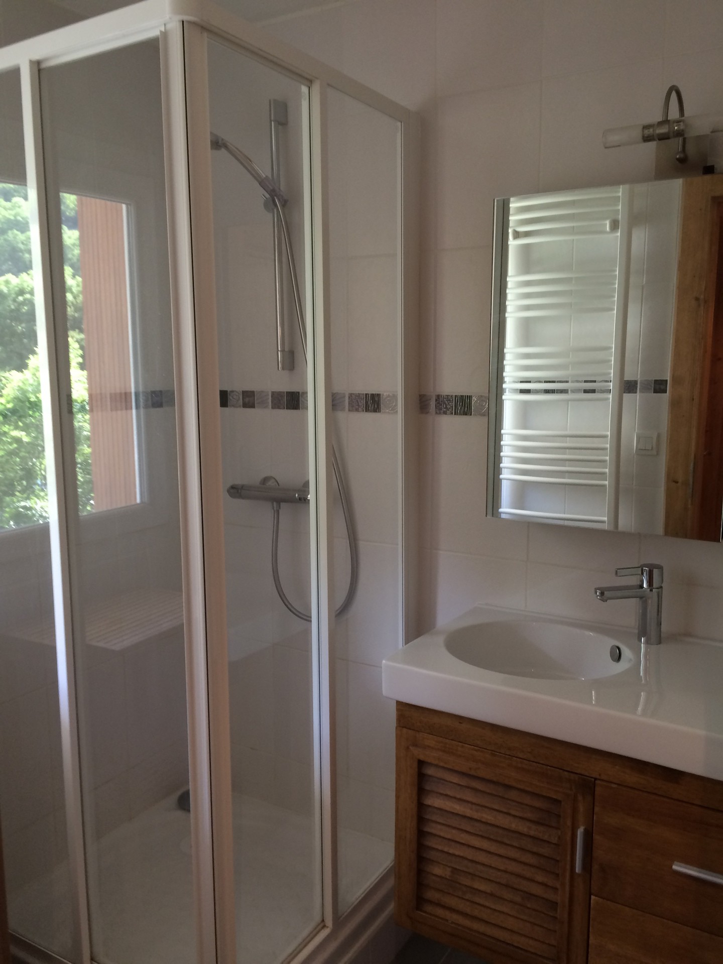 Salle d'eau : lavabo, douche et seche-cheveux