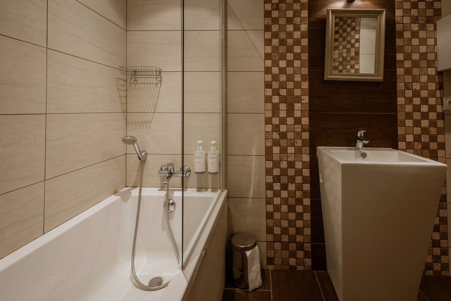 Salle de bains : lavabo, baignoire et seche cheveux. WC independant.