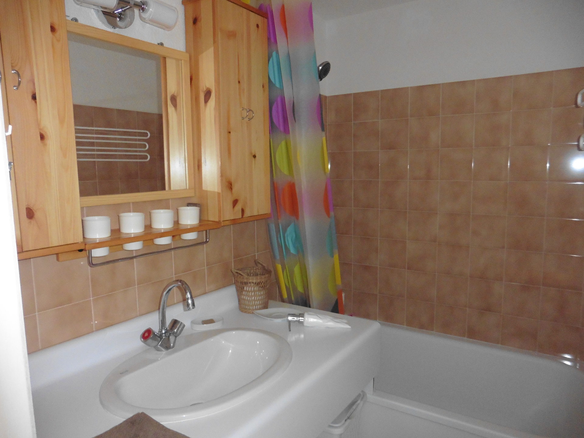 Salle de bains : lavabo, baignoire, sèche-cheveux