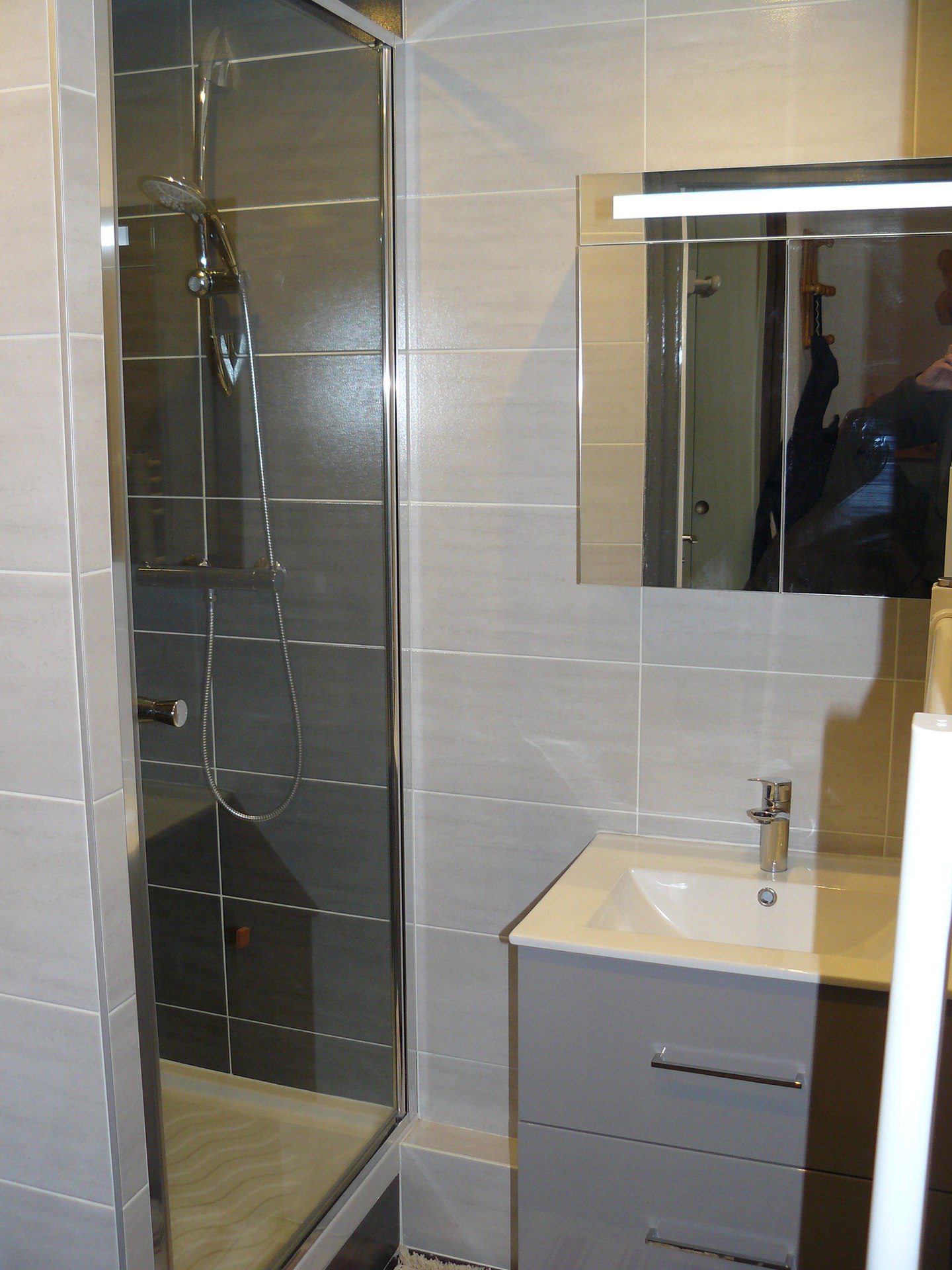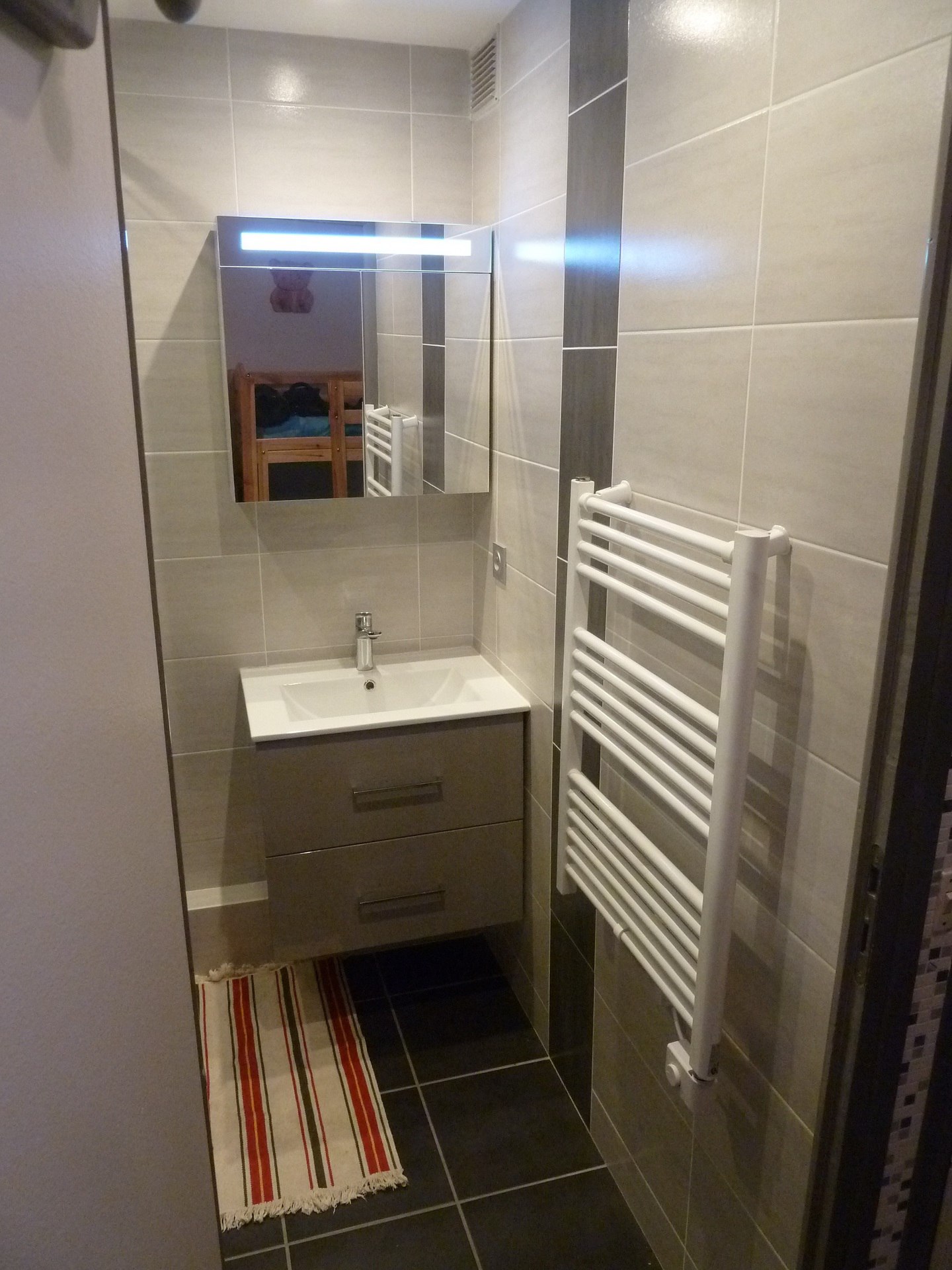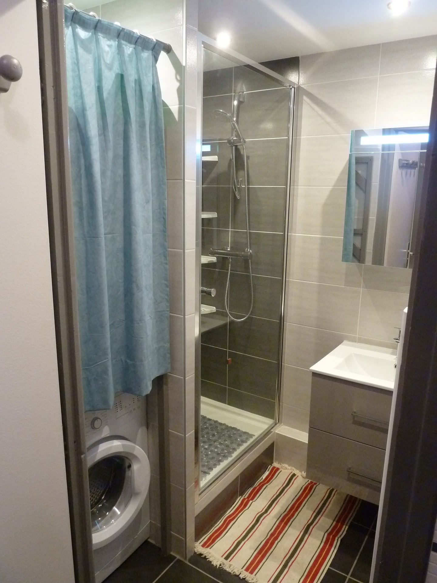 Salle de bains : lavabo, douche, lave-linge et seche-cheveux. WC independant.