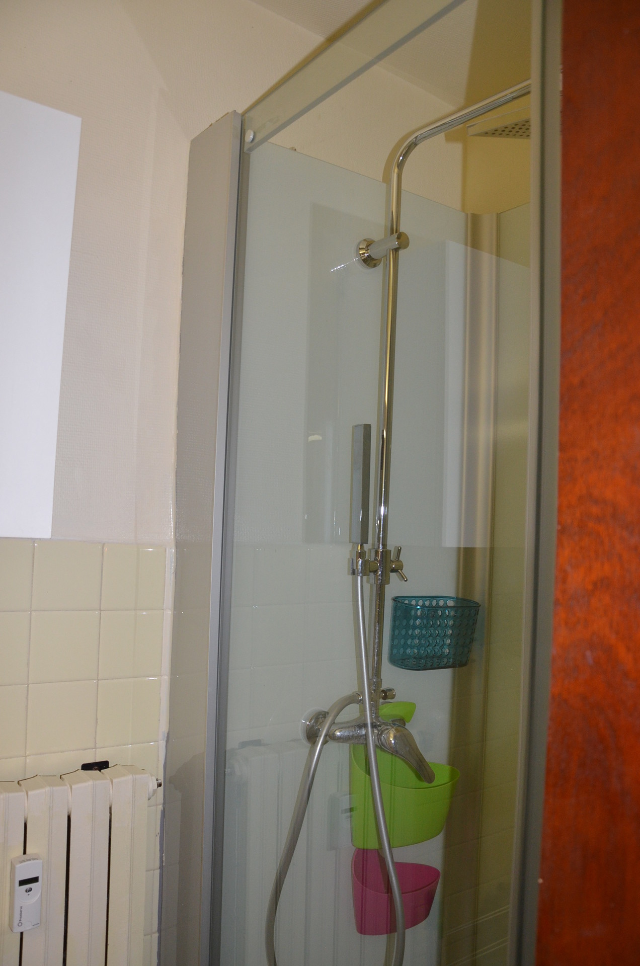 Salle d'eau : douche, lavabo et seche-cheveux.