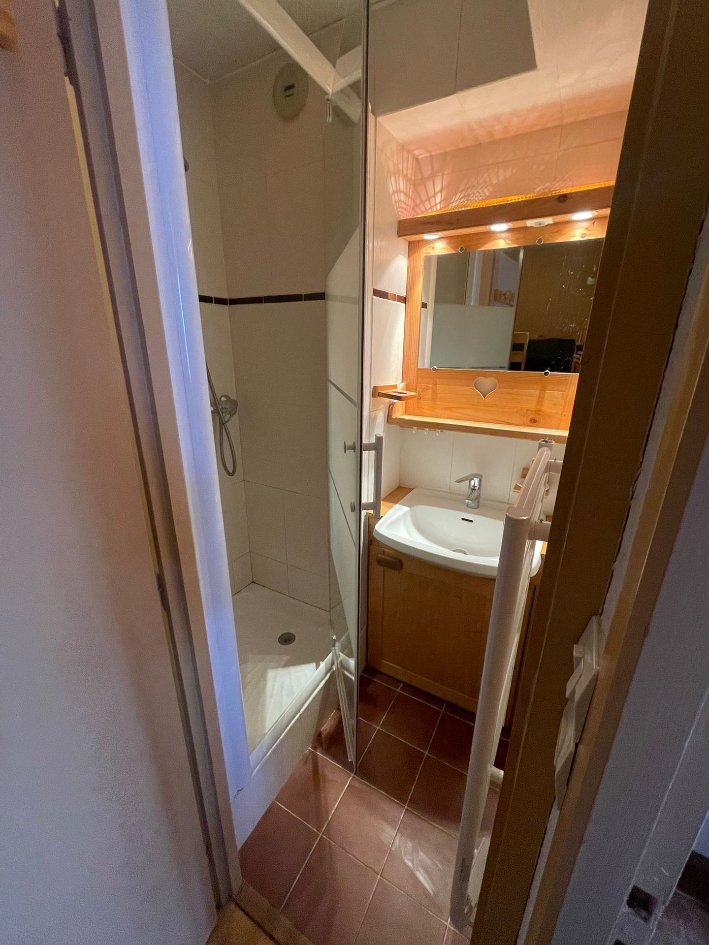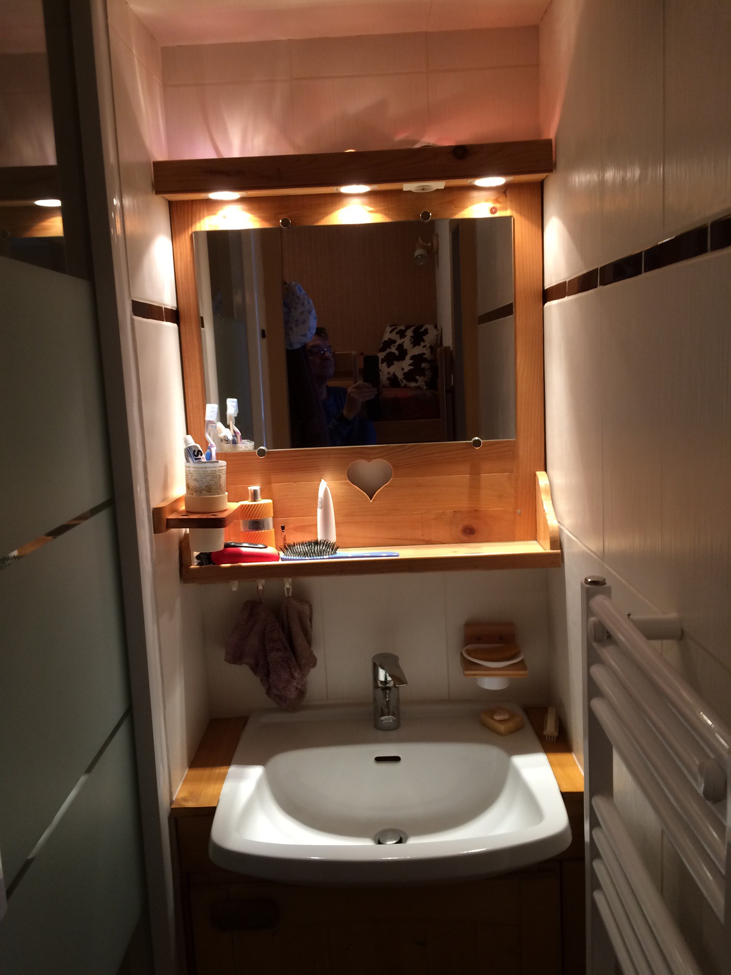 Salle de bains : lavabo, douche et seche cheveux. WC independant.