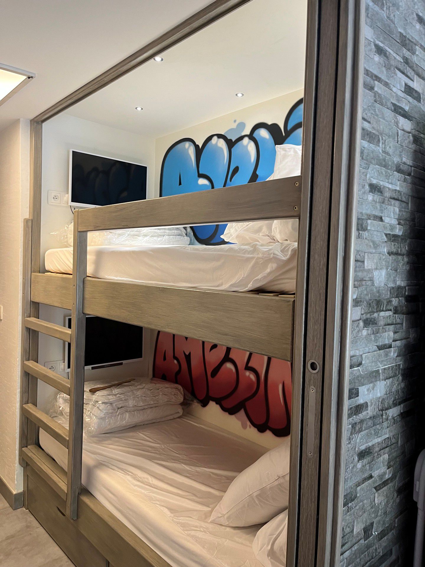 Entree (separee du sejour par une porte/ 5m2) : 2 lits superposes (2x 80x190cm) equipes de TV individuelles avec casque