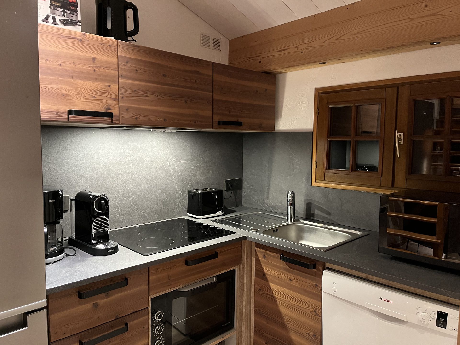 *2ND NIVEAU - PRINCIPAL : entree privative par sa seconde terrasse, piece a vivre avec cuisine ouverte equipee : plaques a induction, four, micro-ondes, refrigirateur et lave-vaiselle. Salon/salle a manger avec canape convertible rapido, television.