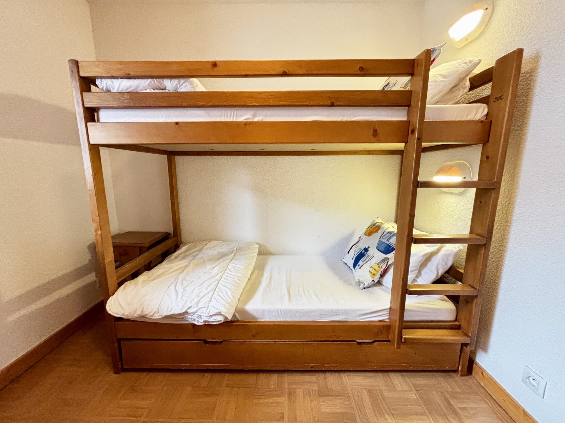 Une premiere chambre composee d'un lit superpose 2*90 cm + un lit tiroir 1*90 cm
