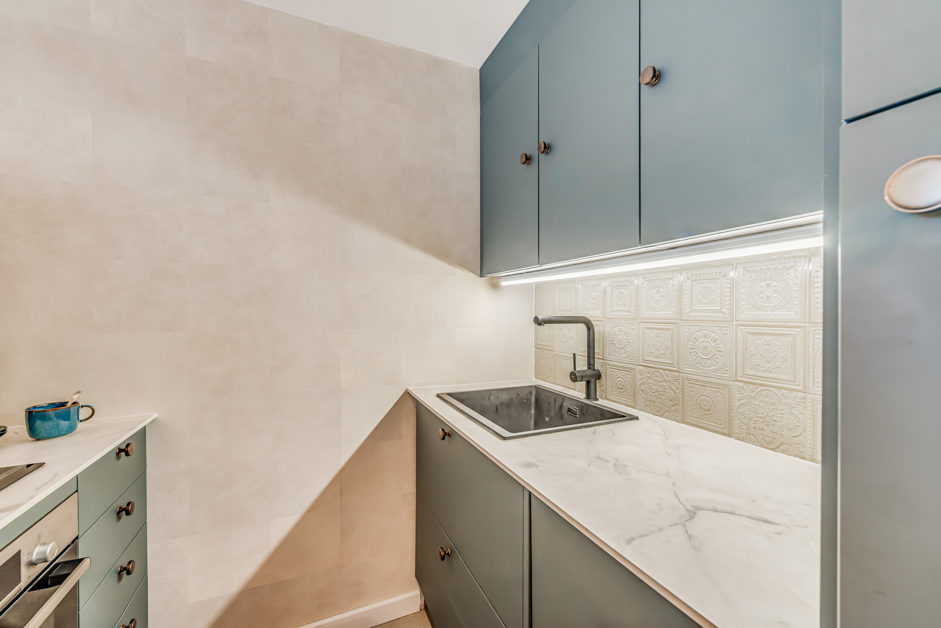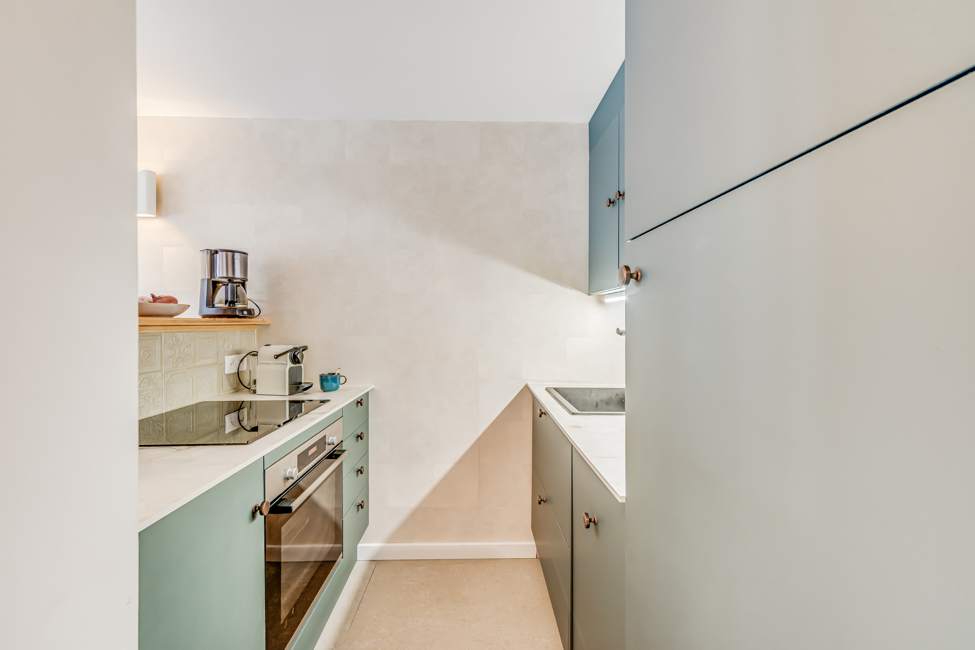 - 1 Cuisine equipee ouverte sur le sejour avec 1 refrigerateur, plaques de cuisson a induction, four, four micro-ondes, lave-vaisselle