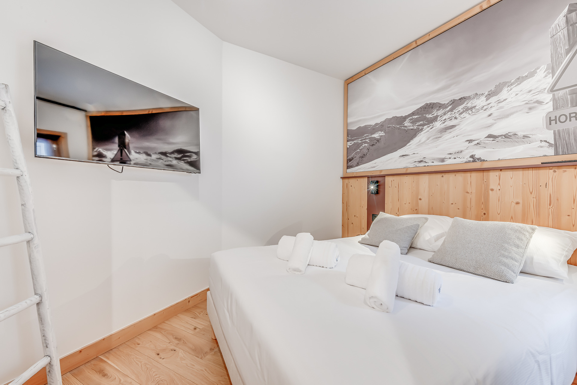 - Chambre/Coin montagne avec 2 lits 1 personne ou lits superposes, television et placard vue balcon