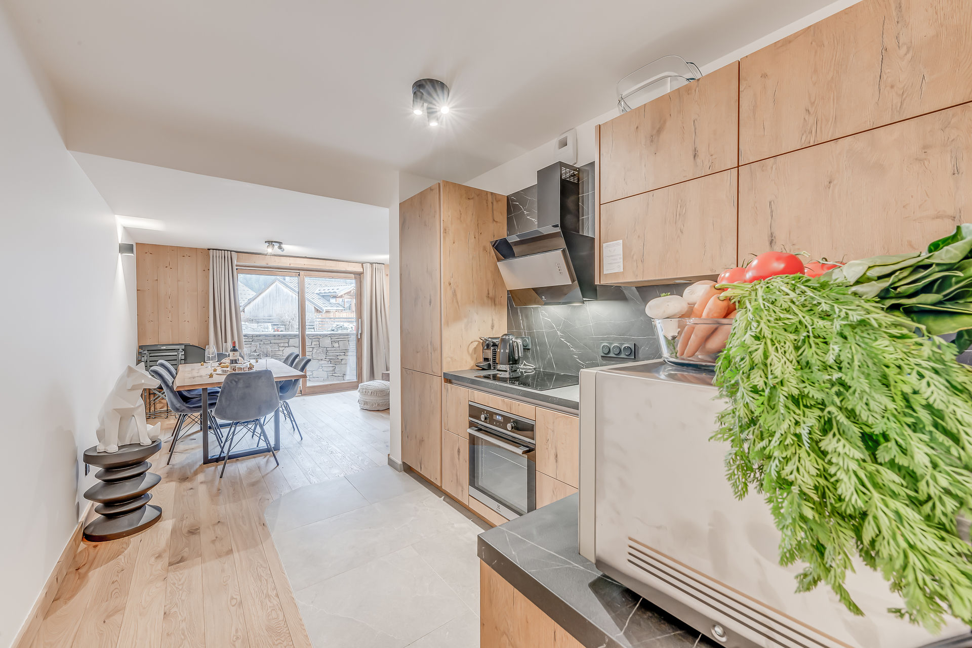 * cuisine toute equipee : four, micro-ondes, plaques induction, refrigerateur et partie congelateur, lave-vaisselle, vaisselle complete