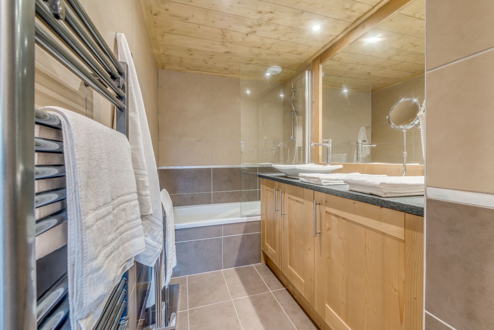 * Salle de bains avec toilettes : douche, meuble vasque, seche serviette, seche cheveux