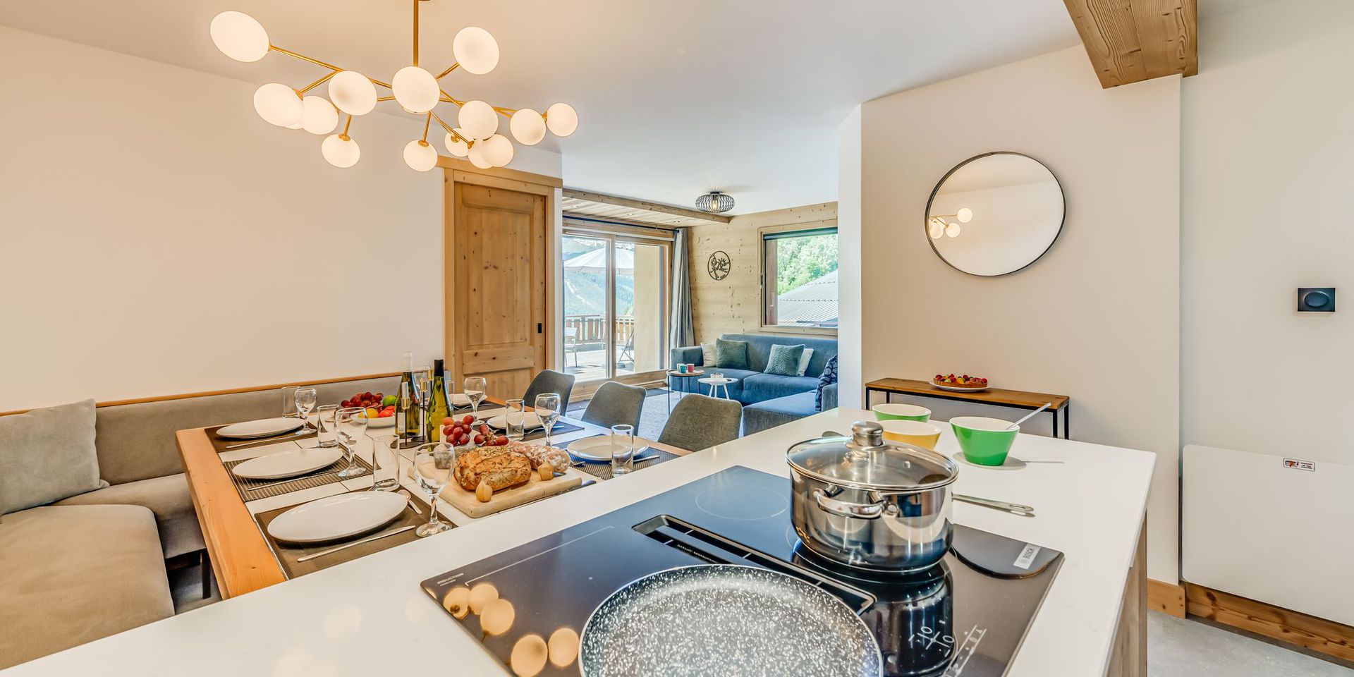 - Cuisine equipee ouverte sur le sejour avec refrigerateur avec partie congelation, plaques de cuisson, four, four micro-ondes, lave-vaisselle