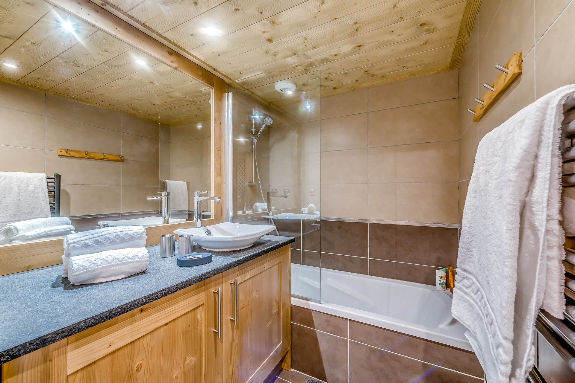 * Salle de bains : baignoire, meuble vasque, seche serviette, seche cheveux, lave linge sechant