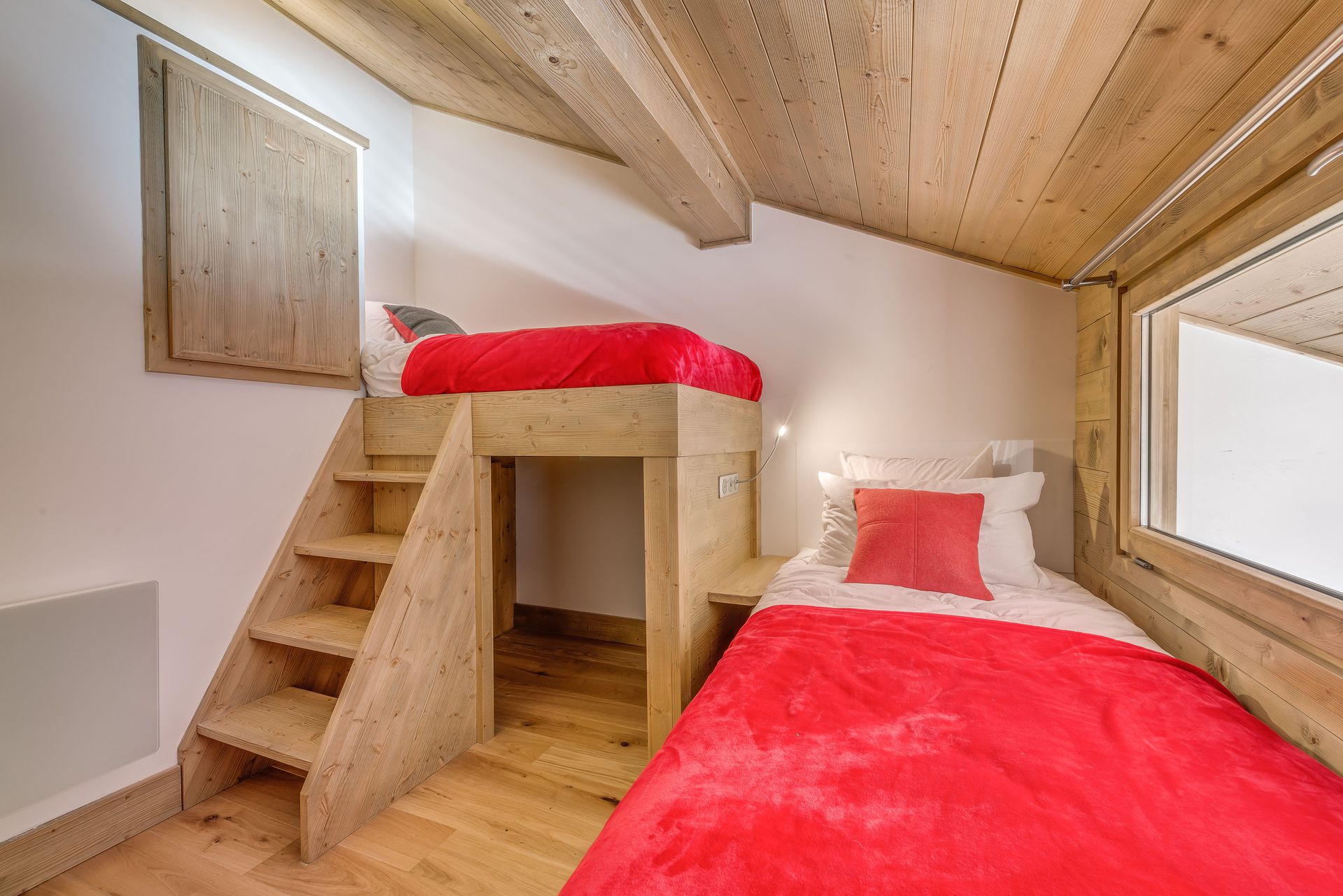 * Chambre 2 (cabine fermee avec ouverture donnant sur la chambre) en Mezzanine : 2 lits simples (90x200), chevets, lampes de chevets, placard avec etagere et penderie