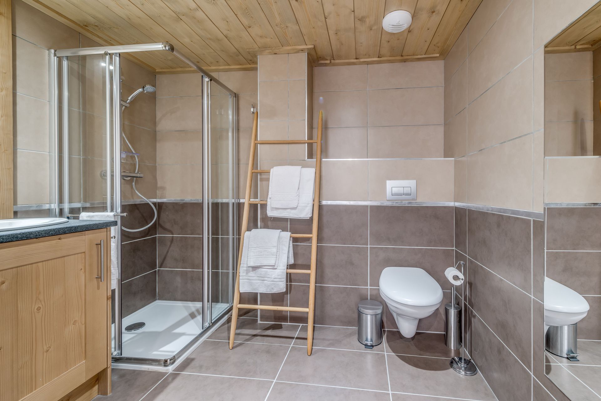 * Salle de bains avec toilettes : douche, meuble vasque, seche serviette, seche cheveux