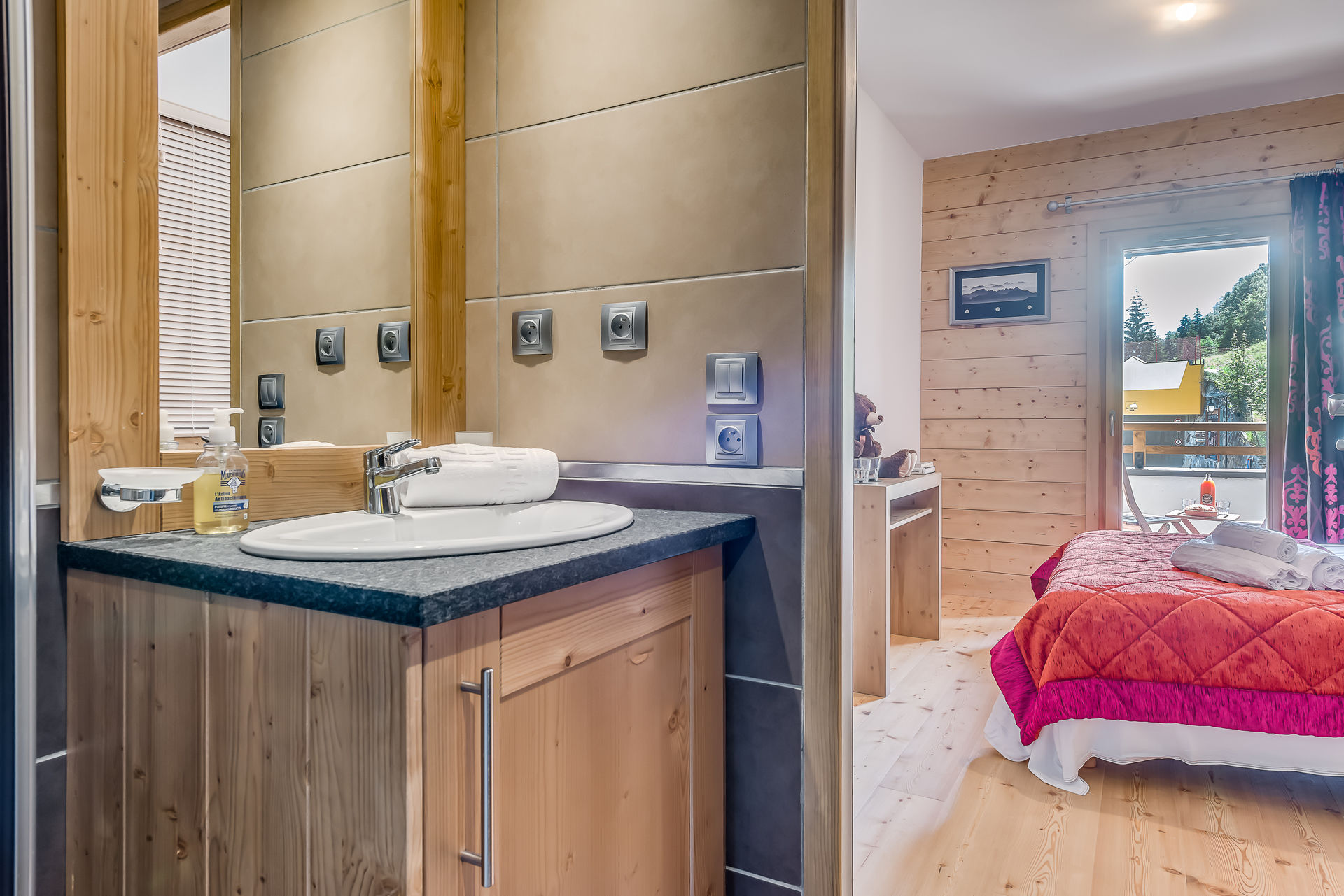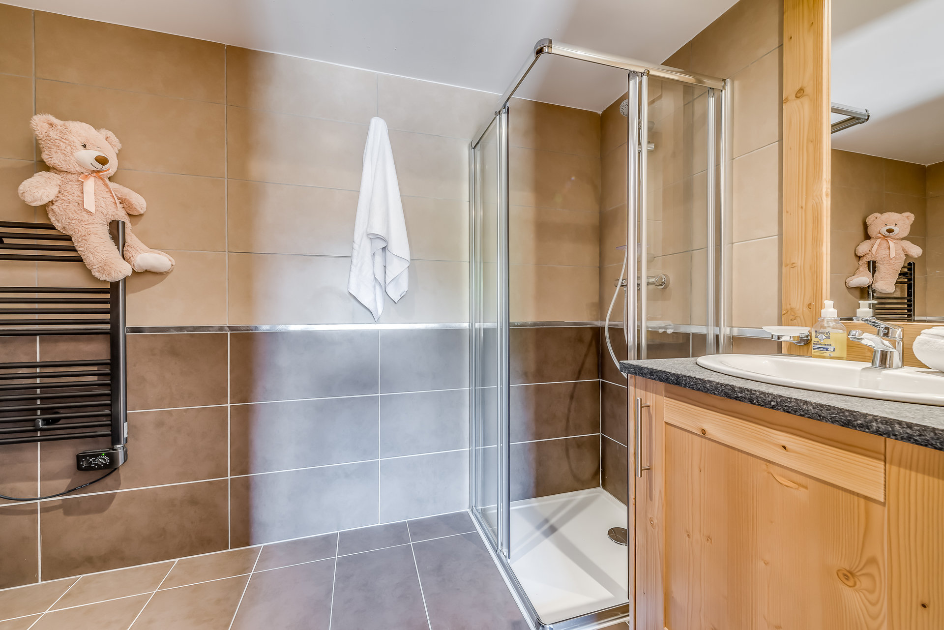 - Salle de bains : douche, meuble vasque, sèche serviette, sèche cheveux, WC