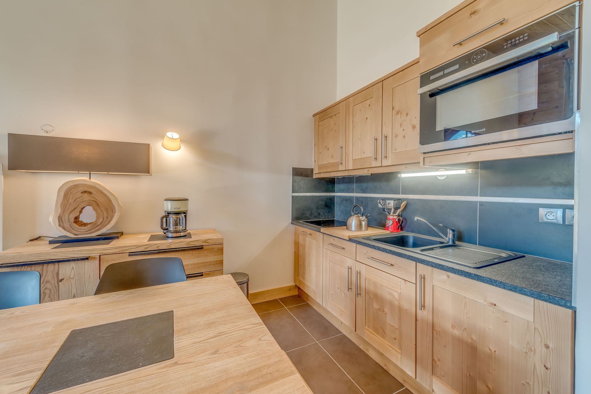 * Cuisine completement equipee : refrigerateur avec freezer, four combine, lave vaisselle, plaques vitroceramiques, cafetiere, machine a cafe TASSIMO, bouilloire, grille pain
