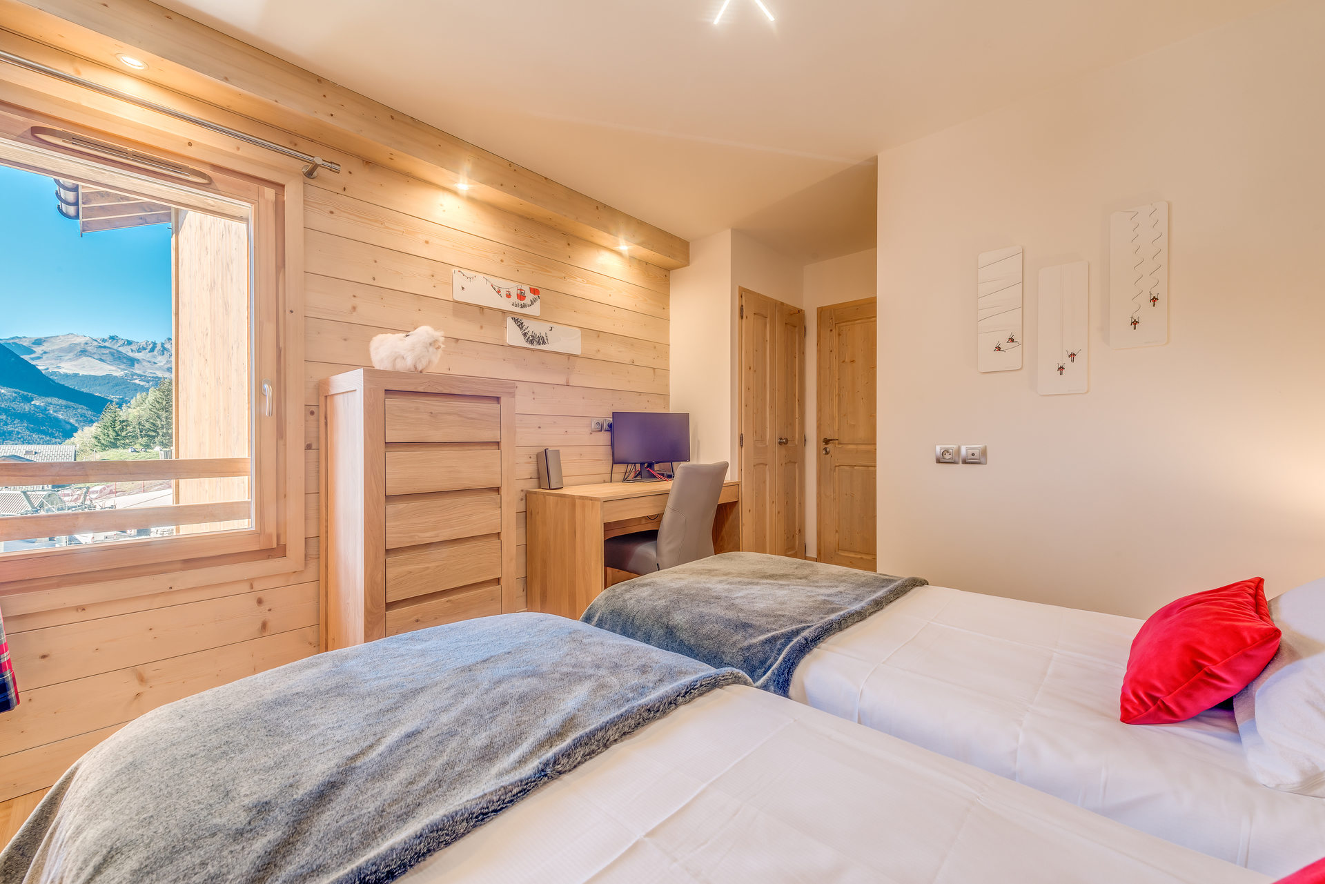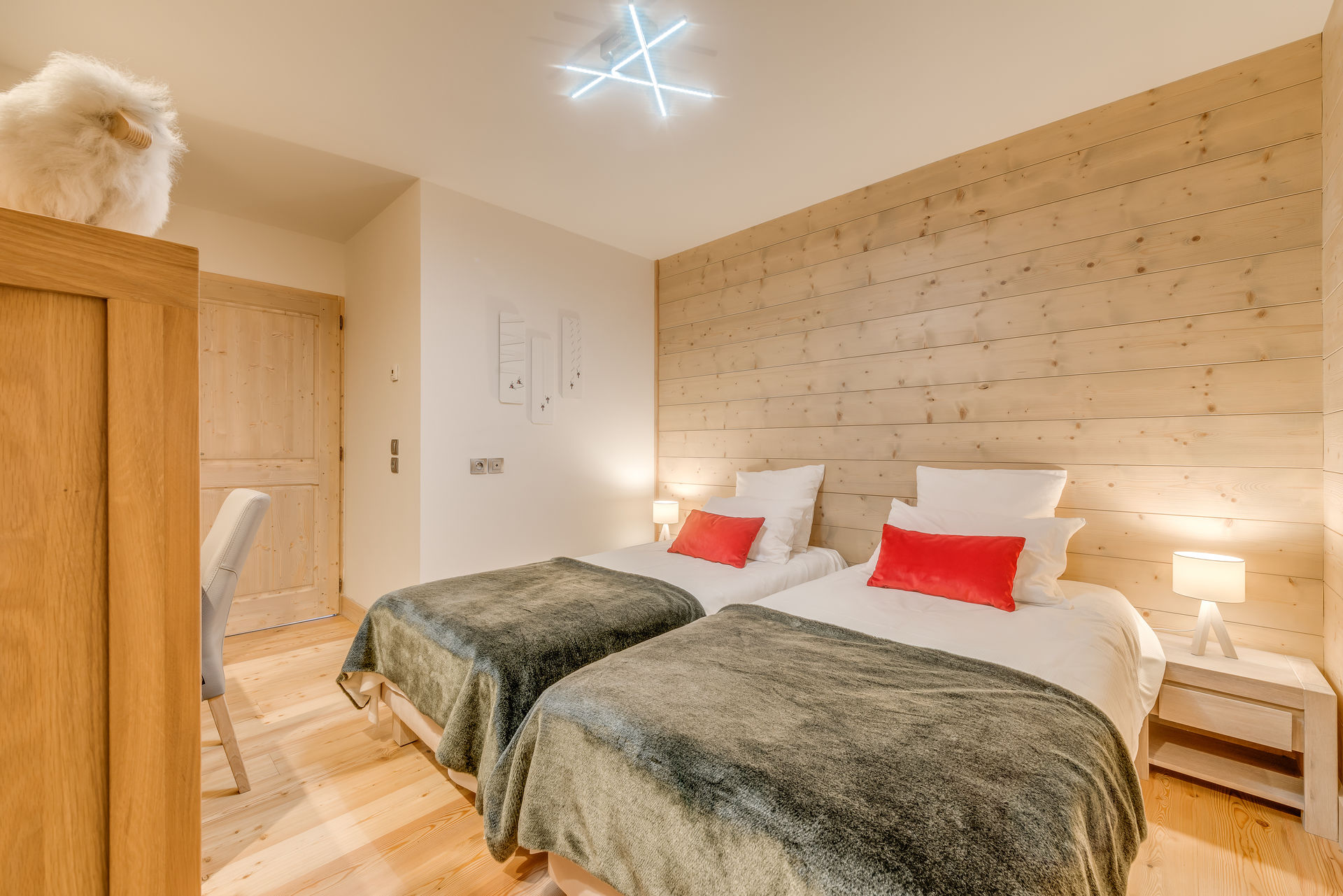 * Chambre 2 : 2 lits simples (90x200), chevets, lampes de chevet, placard avec etagere et penderie, bureau avec ecran d'ordinateur, Apple TV / chromecast