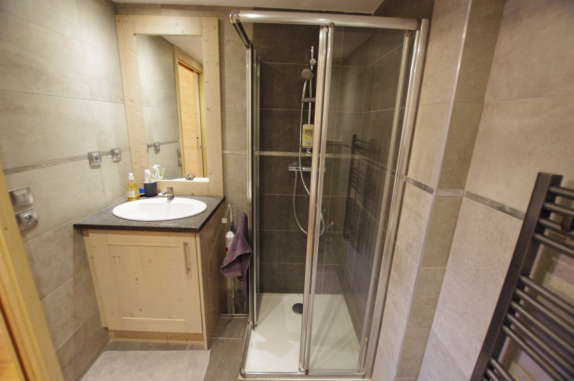 * Salle de bains : douche, meuble vasque, seche serviette, seche cheveux