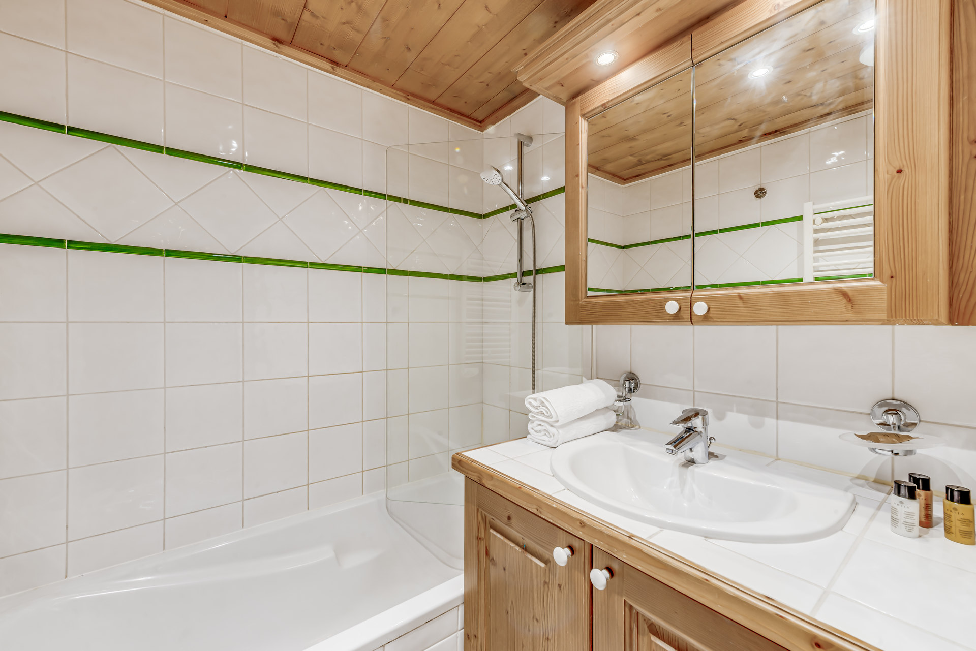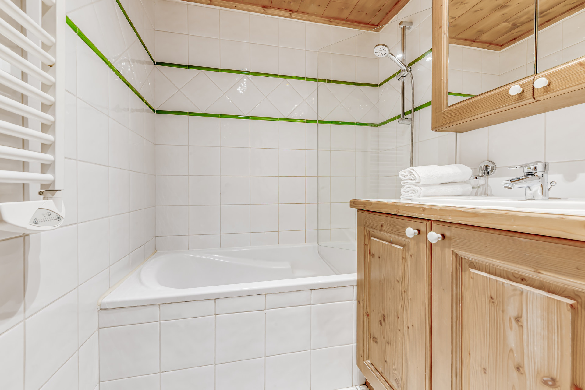 - 1 salle de bains avec baignoire, meuble vasque, radiateur seche serviettes