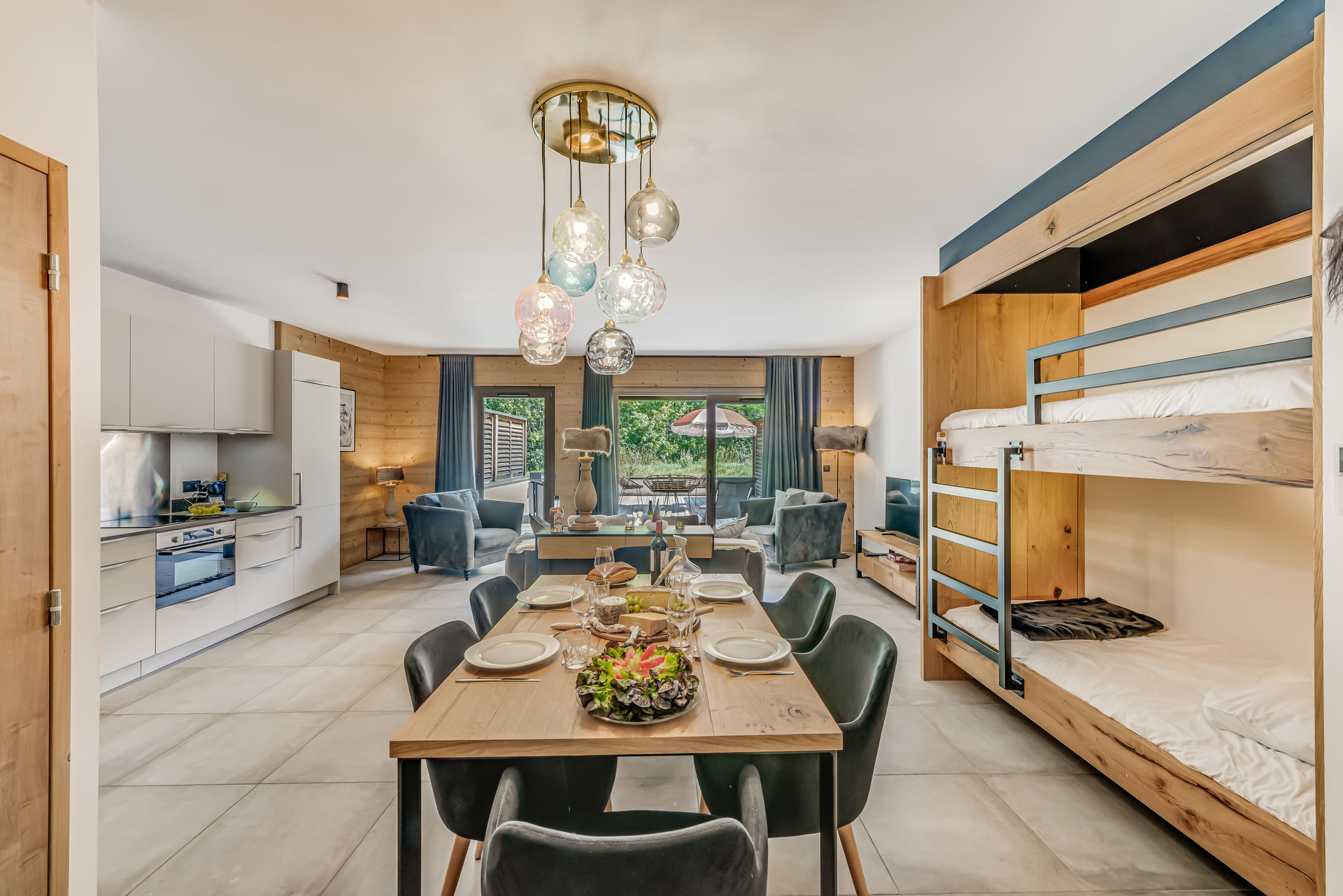 - 1 Coin montagne ouvert sur le sejour avec 2 lits superposes (90X200)