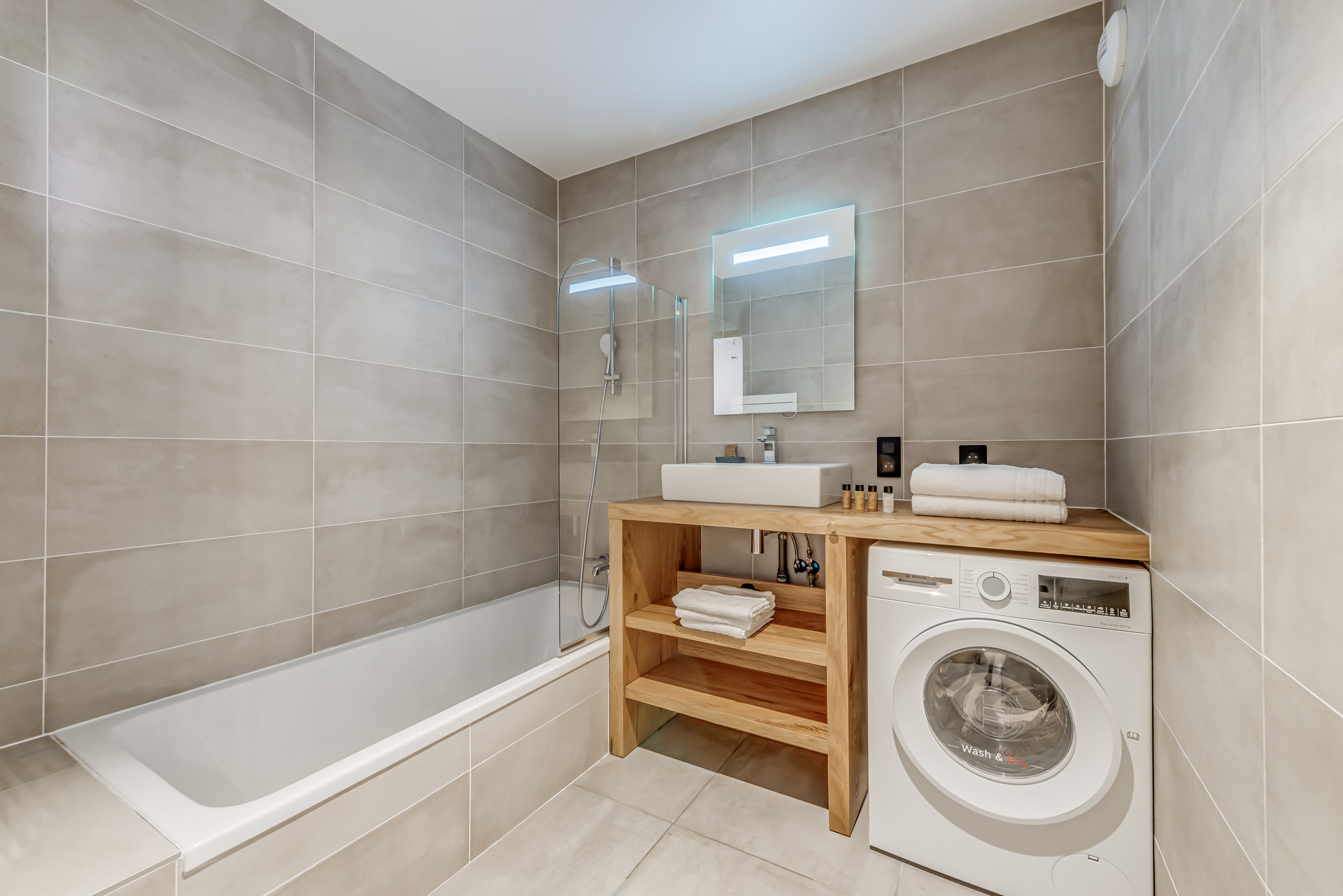 - 1 Salle de bains avec baignoire, meuble vasque, radiateur seche serviettes et lave-linge sechant