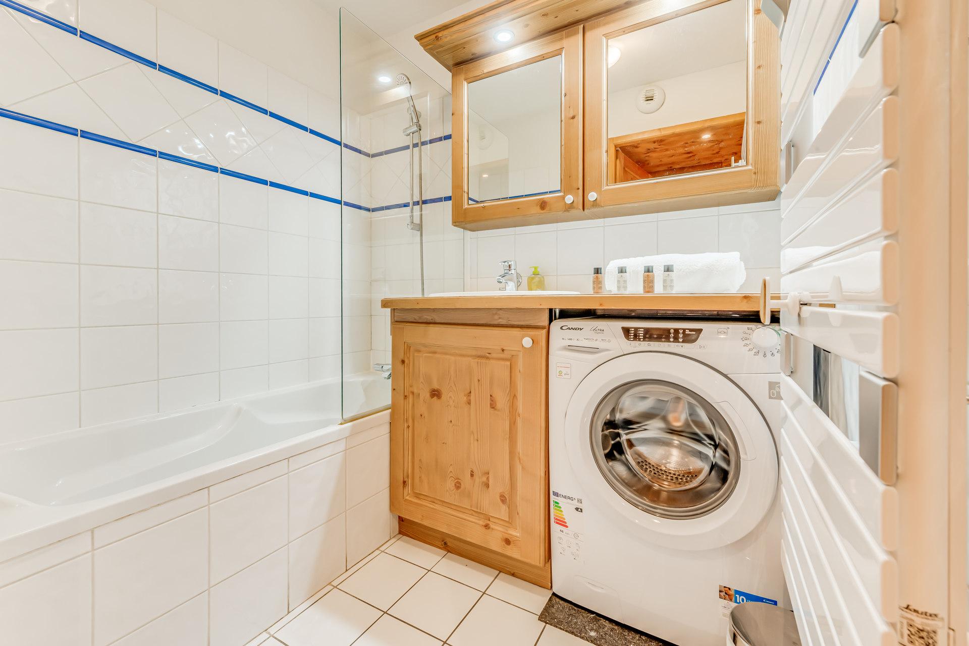- Salle de bains avec baignoire, pare-douche en verre, meuble vasque, radiateur seche serviettes et machine a laver