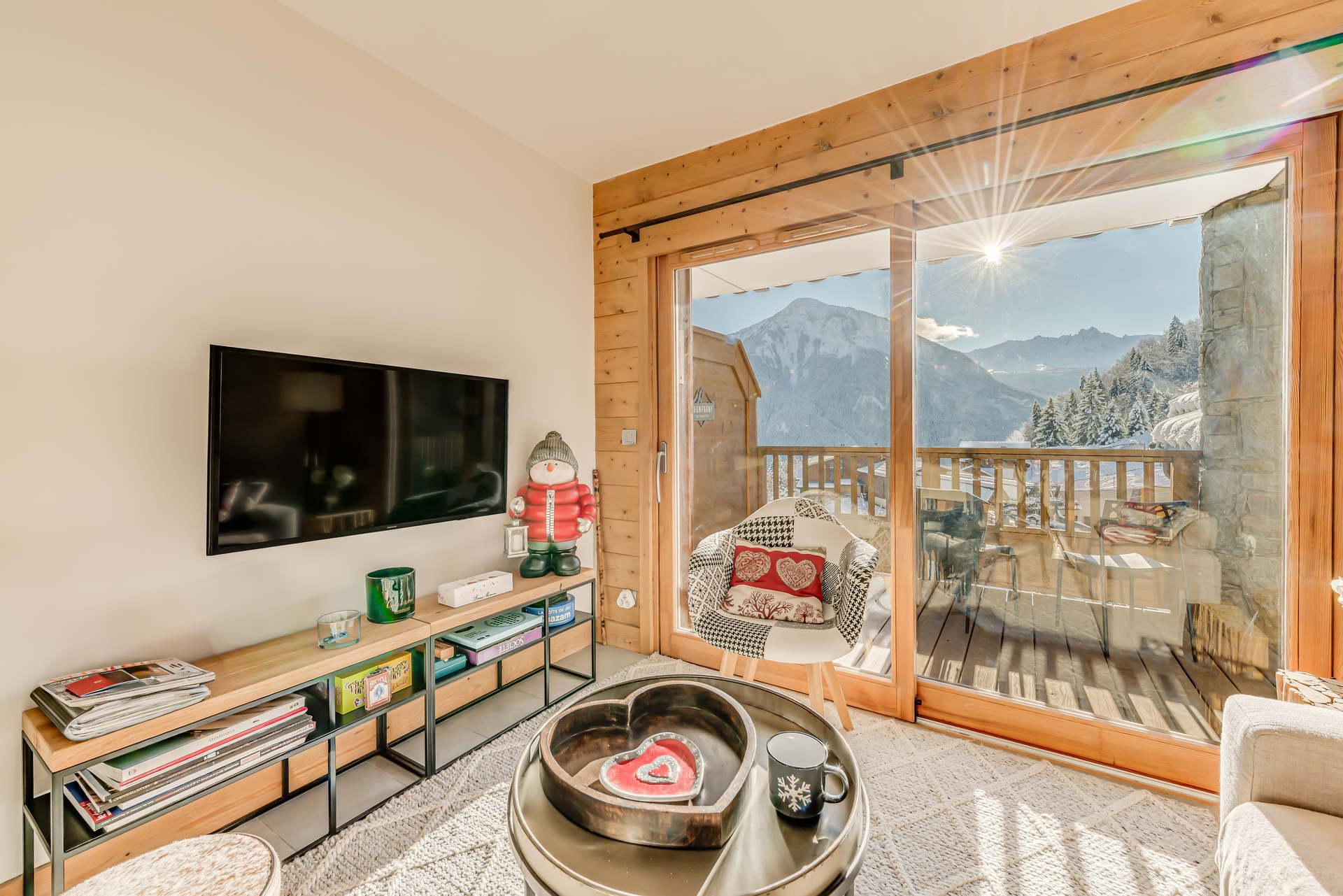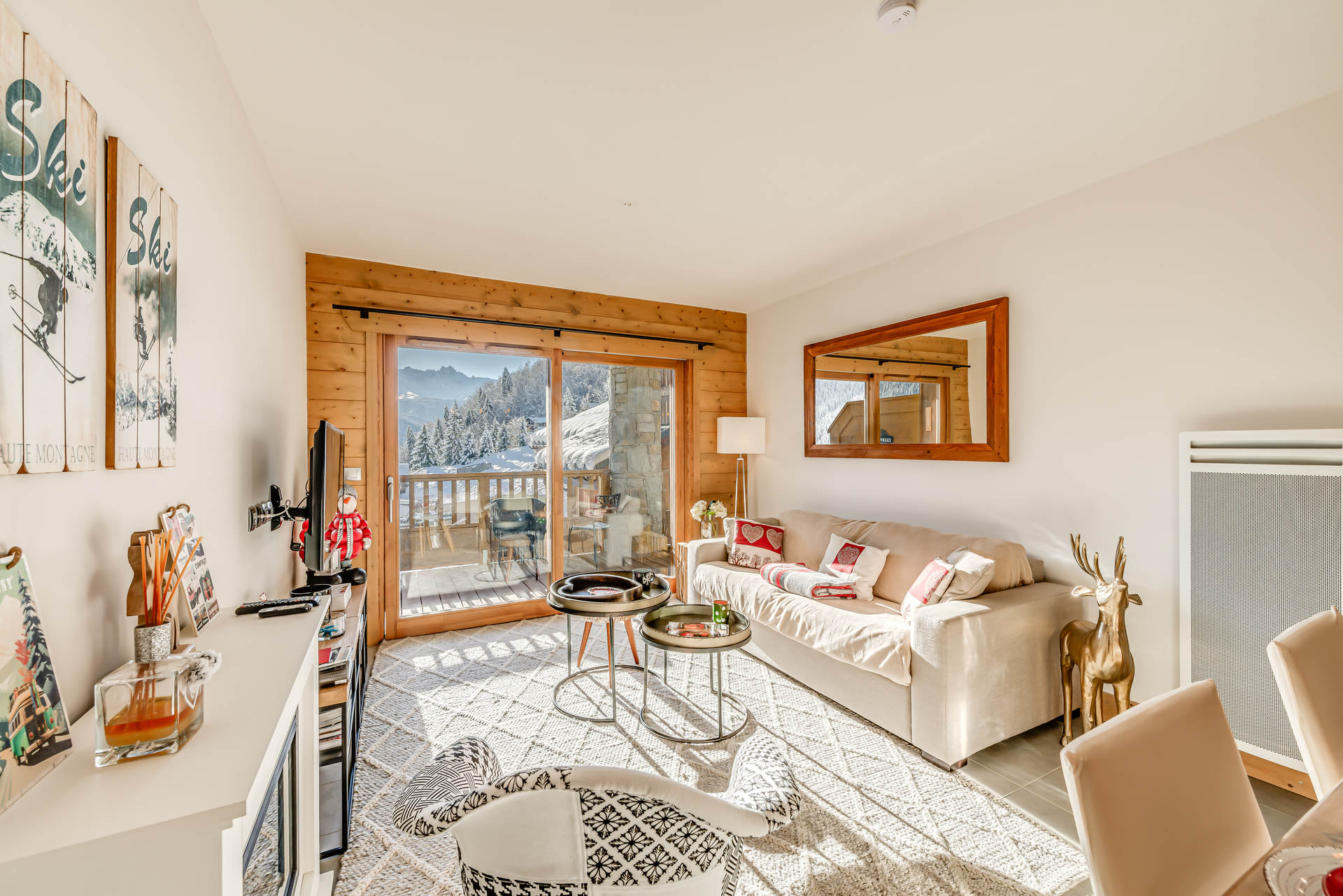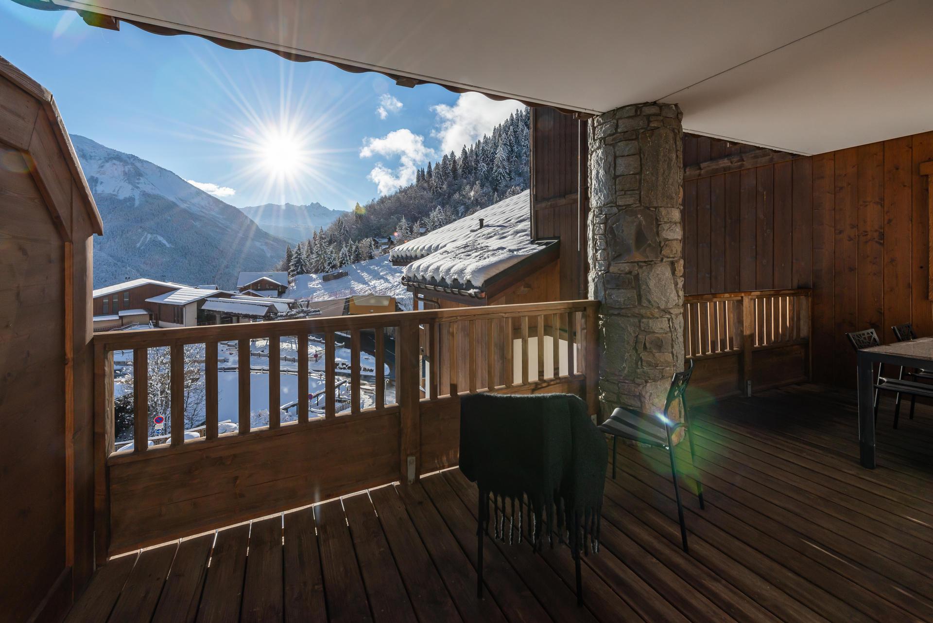 Il est compose d'un sejour avec balcon oriente Sud, d'une cuisine completement equipee avec coin repas, de 2 chambres independantes, d'une salle de bains avec toilettes separees et d'une salle de douche avec toilettes, d'une grande terrasse de 12 m2 totalement amenagee avec vue sur les montagnes et Courchevel.