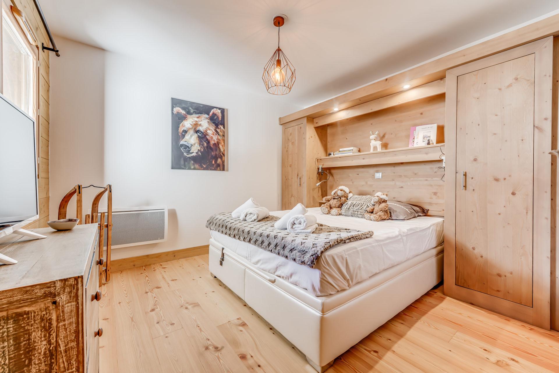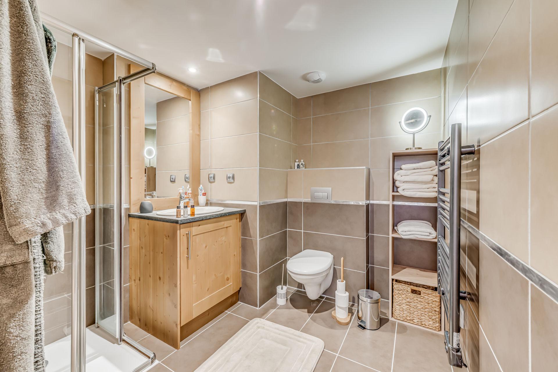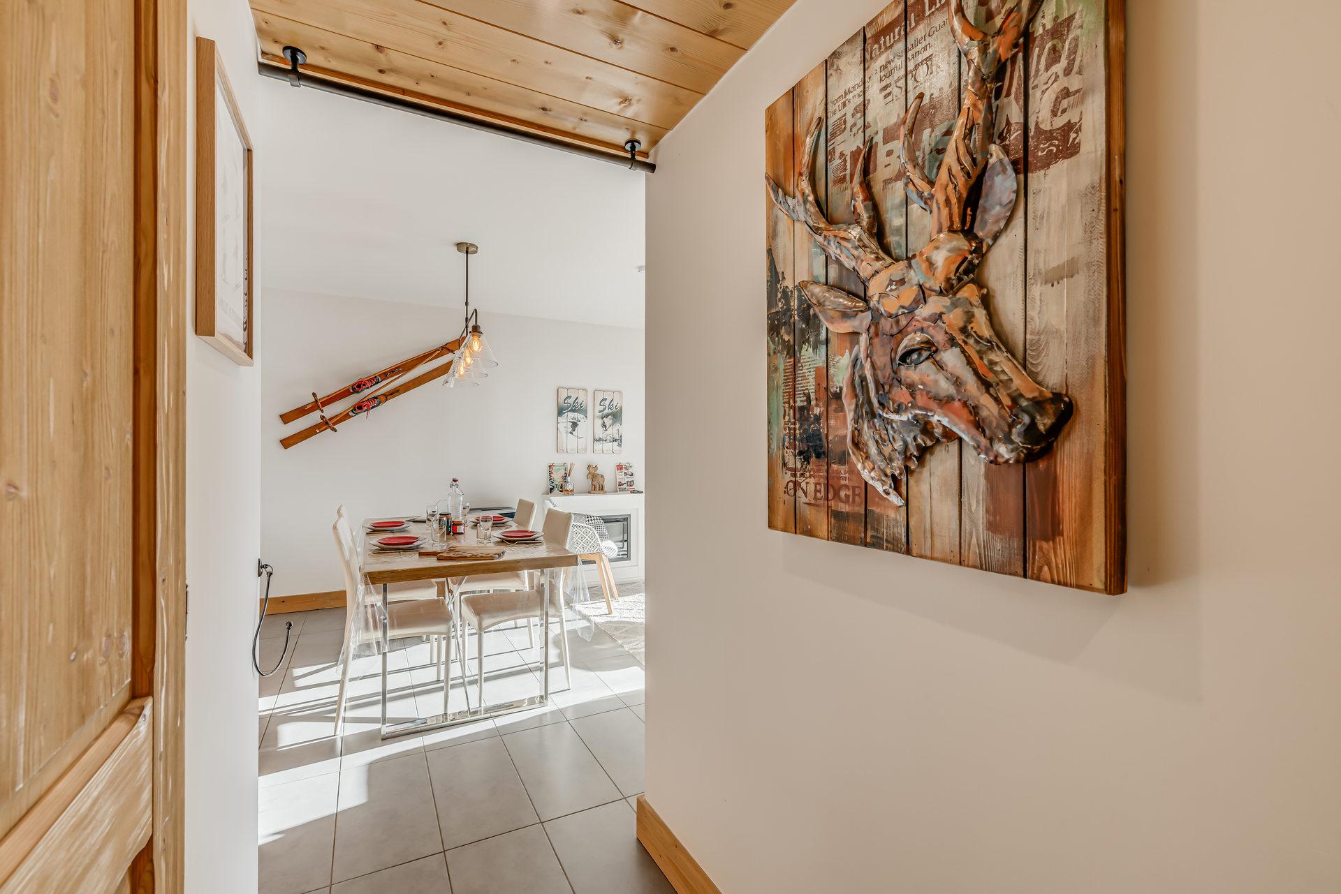 Il est compose d'un sejour avec balcon oriente Sud, d'une cuisine completement equipee avec coin repas, de 2 chambres independantes, d'une salle de bains avec toilettes separees et d'une salle de douche avec toilettes, d'une grande terrasse de 12 m2 totalement amenagee avec vue sur les montagnes et Courchevel.