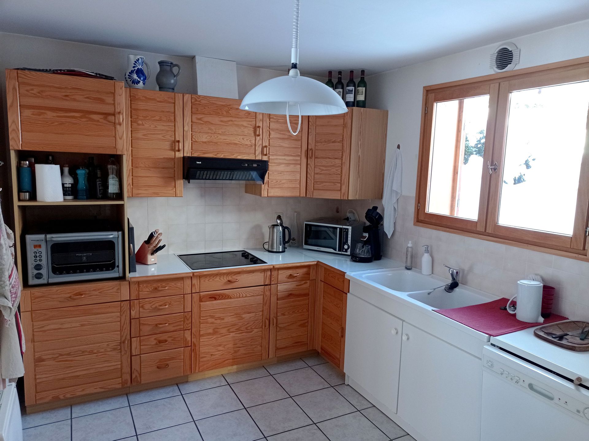 + un couloir avec toilettes conduit à la cuisine toute équipée, mais aussi au salon avec canapés, fauteuils et poèle à bois, porte accès terrain/pelouse/terrasse extérieure et coin repas avec table et chaises pour 7 personnes.