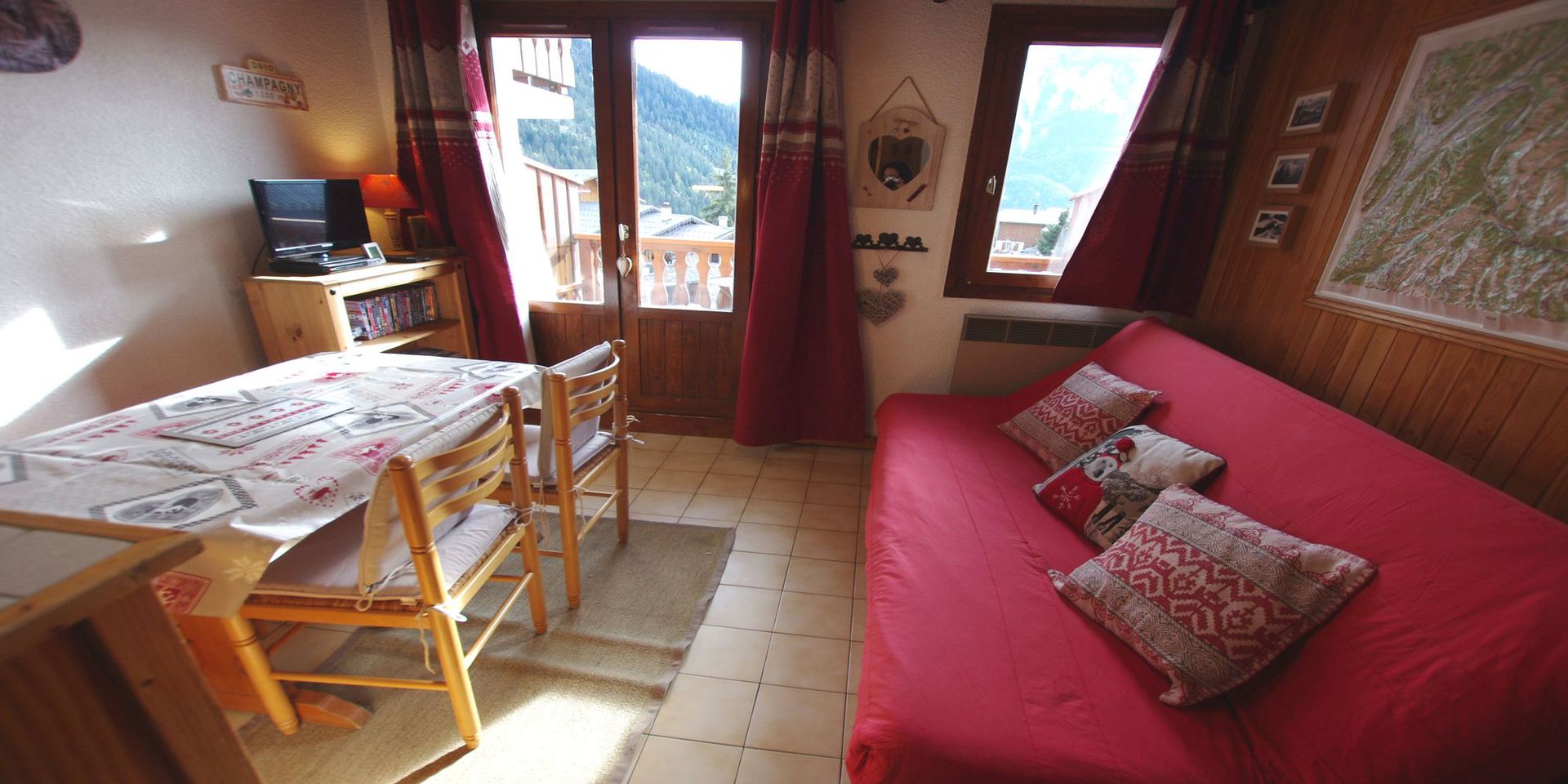 - coin repas et salon avec canape-lit 2 personnes (140x190) et couette ouvrant sur un balcon plein SUD