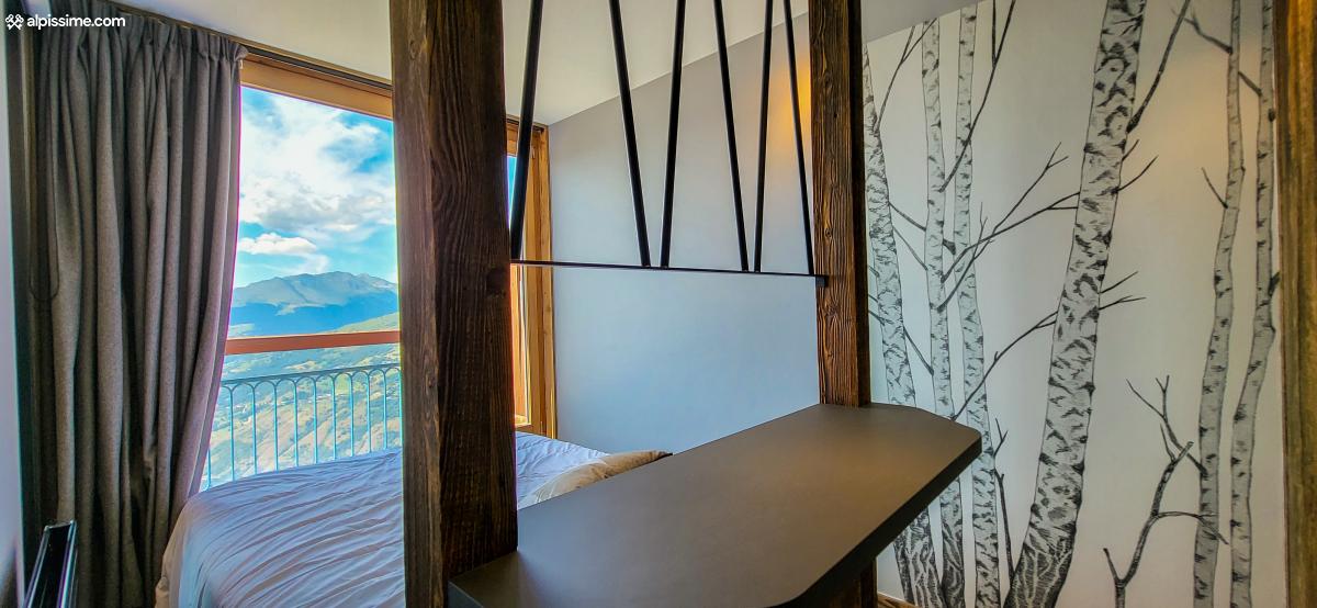 - Une chambre principale avec un lit de qualité orienté vers une grande baie vitrée pour admirer le paysage, complétée par un bureau ergonomique pour ceux qui souhaitent combiner détente et travail.