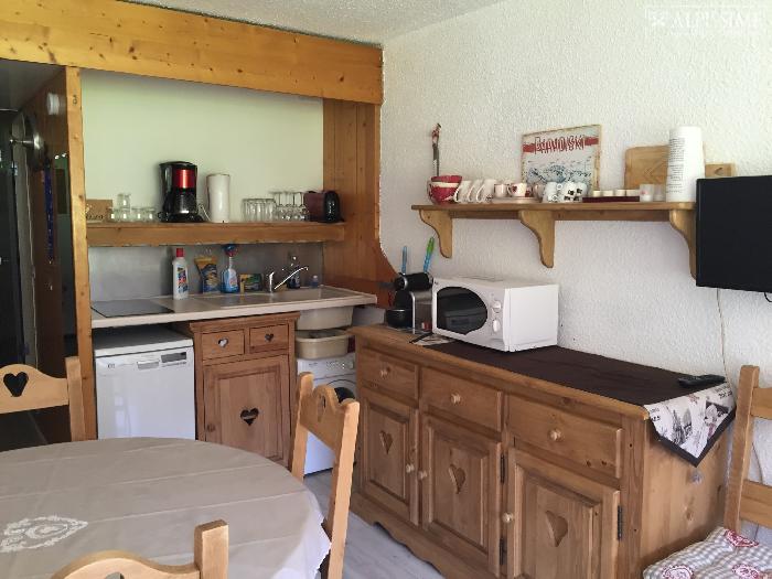 Pièce à vivre avec coin cuisine et coin salon - la banquette nova se déplie rapidement pour se transformer en un couchage 120X140. Couettes et oreillers à disposition.
