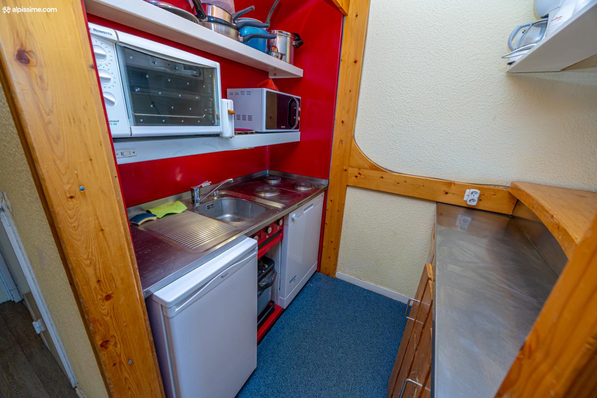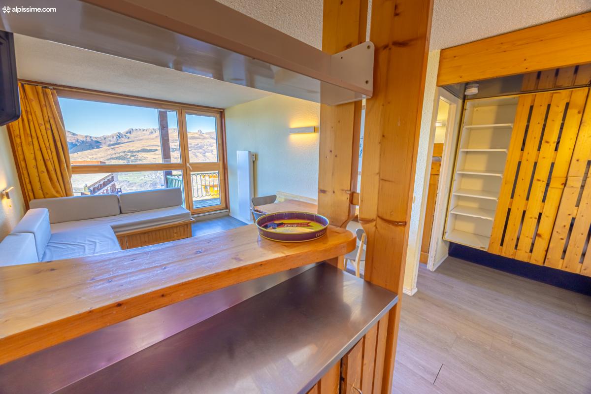 - Une pièce de vie avec une cuisine ouverte sur un salon lumineux, accueillant 2 banquettes simples pouvant être rapprochées. Le salon donne sur un balcon qui surplombe l'allée des commerces