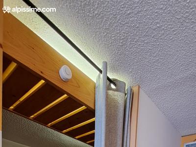 Coin montagne avec 2 lits supersposés (plus un lit gigogne 80 cm pour faire un lit double ou un lit simple supplémentaire) fermé par une demi cloison et un rideau
