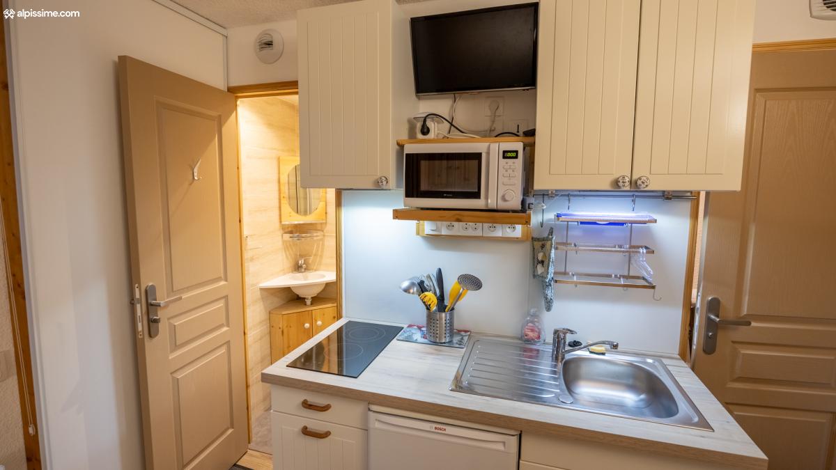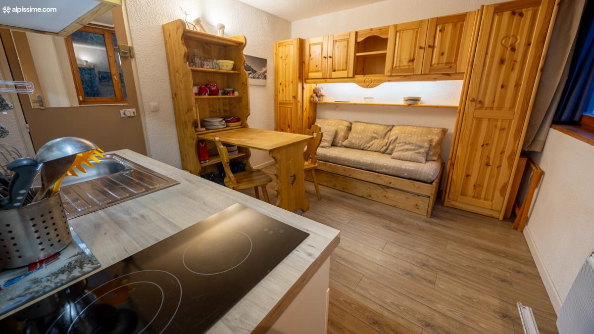 La studette se compose d'une pièce de vie accueillant un canapé-lit gigogne, une salle d'eau, des WC séparés, et un placard ingénieusement aménagé permettant de ranger skis et bâtons facilement et sans risques.