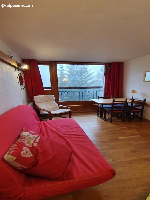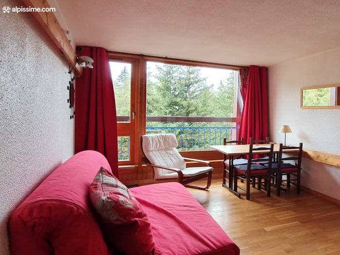 - d'une pièce de vie avec une grande baie vitrée donnant sur un balcon plein sud avec vue sur les sapins et la vallée, un canapé lit confortable 160x200, un fauteuil, téléviseur écran plat ainsi qu'une table et 4 chaises.