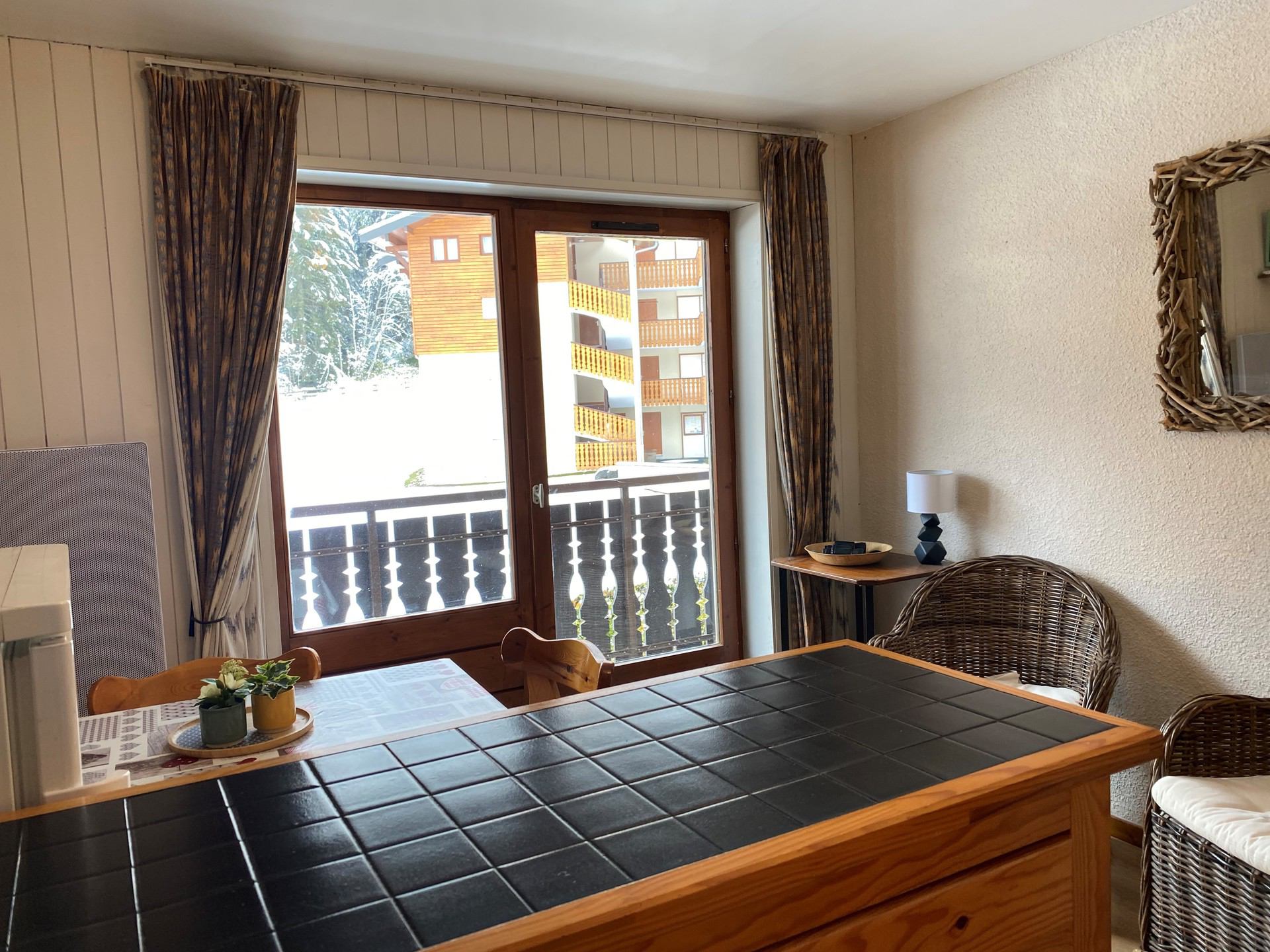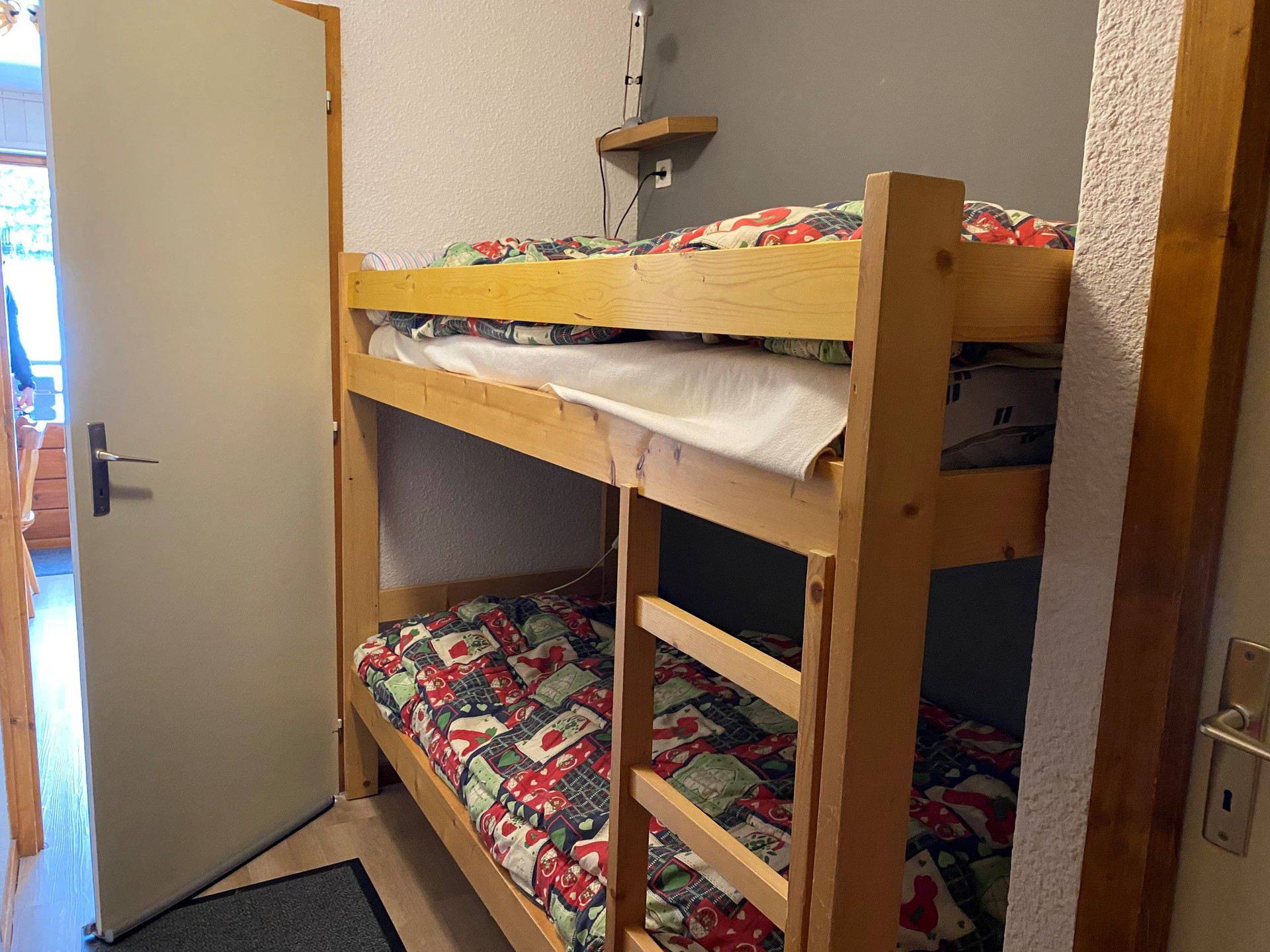 A l'entree, vous trouverez un coin montagne avec 2 lits superposes, 2 chambres dont une avec 2 lits superposes et un canape lit, et une autre avec un lit double, une salle de bains, un WC separe, un sejour, une cuisine, et un balcon mesurant 8 m2.