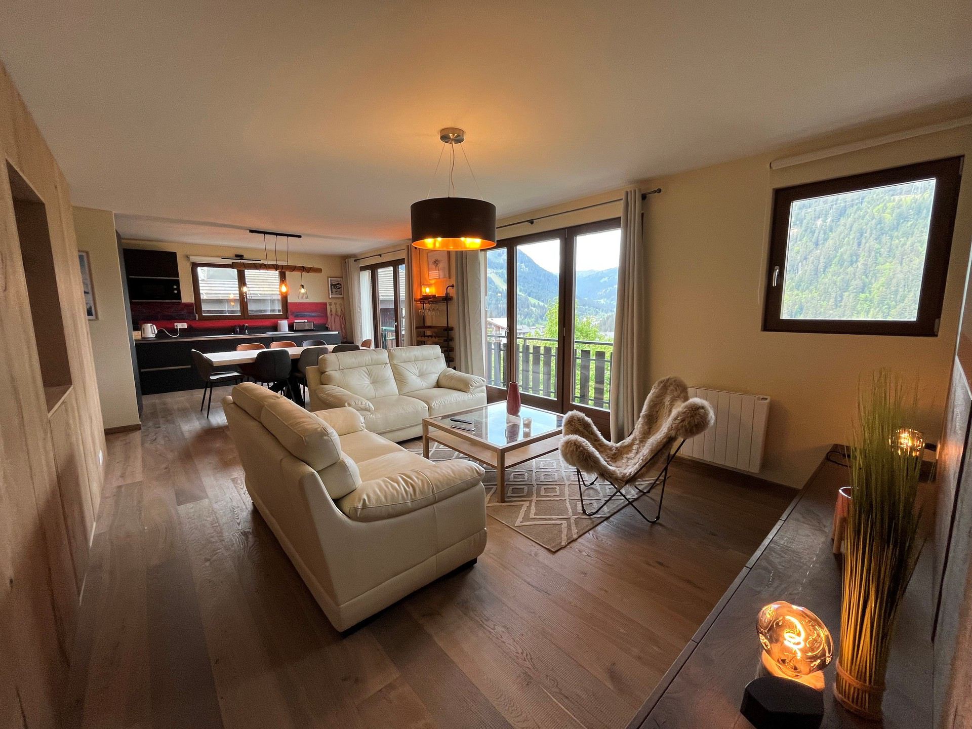 La pièce à vivre lumineuse et spacieuse est un lieu de détente parfait pour se retrouver après une journée de ski. Vous pourrez vous détendre sur le canapé confortable tout en admirant la vue spectaculaire sur les montagnes avoisinantes! Vous avez à votre disposition un écran plat et une xbox pour animée vos soirées.