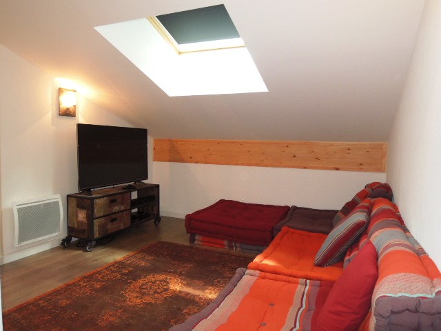 A l'etage il y a : une grande chambre, une salle de douche avec WC, et d'un salon TV.