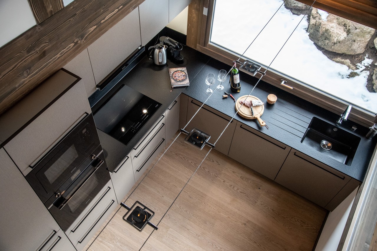 Le rez-de-chaussee est compose d'une cuisine equipeed'un four, un mico-onde,d'une cafetiere a capsule, d'une bouilloire ouverte sur le sejour avec une belle terrasse avec vue montagne et un salon avec la TV recevant plusieurs chaines francaises et etrangeres ainsi qu'un lecteur DVD et un grand choix de DVD a disposition. Il y a egalement un local a ski et un garage.