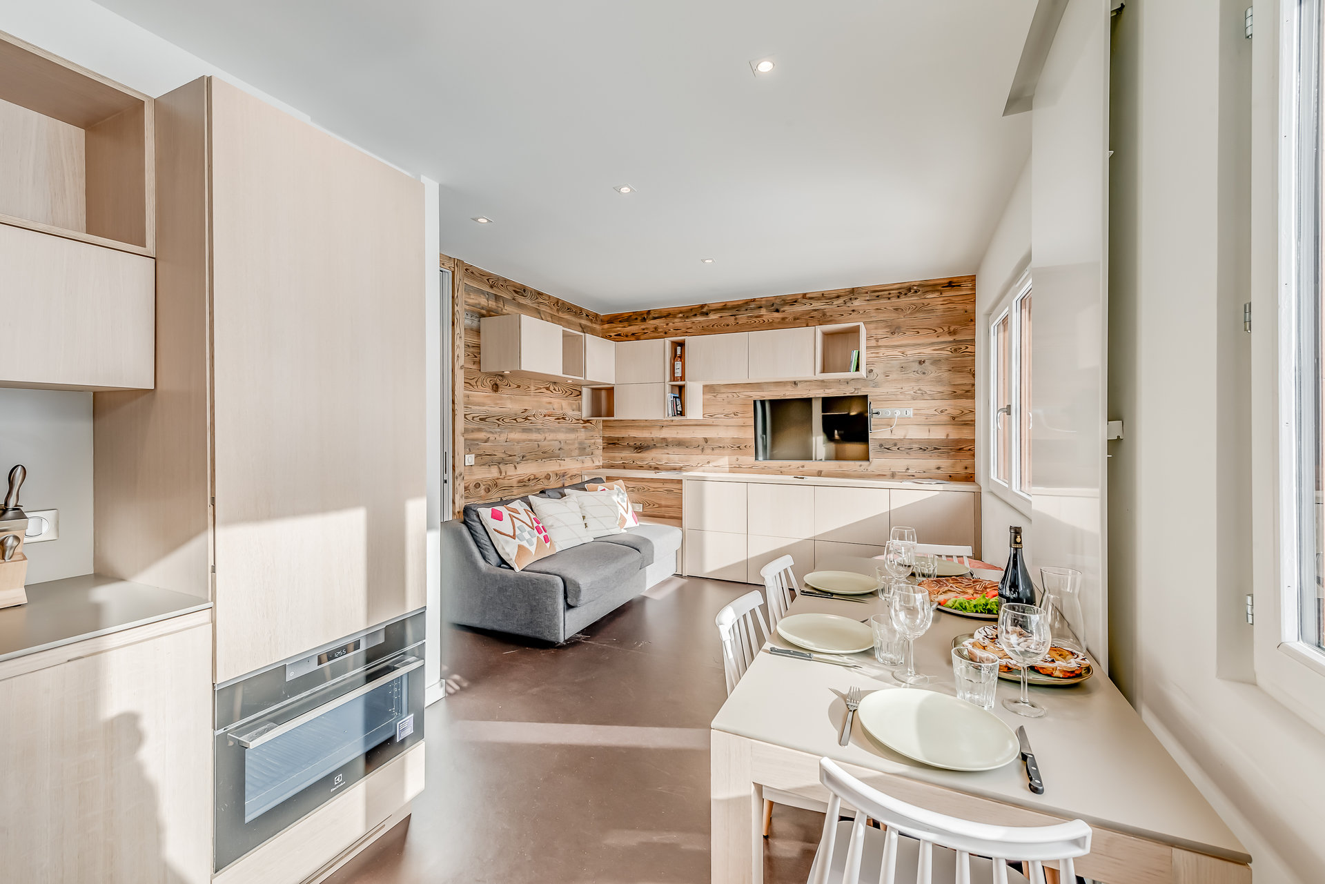 * cuisine ouverte entierement equipee ; lave-vaisselle, four, four micro-ondes, plaques vitroceramique, refrigerateur