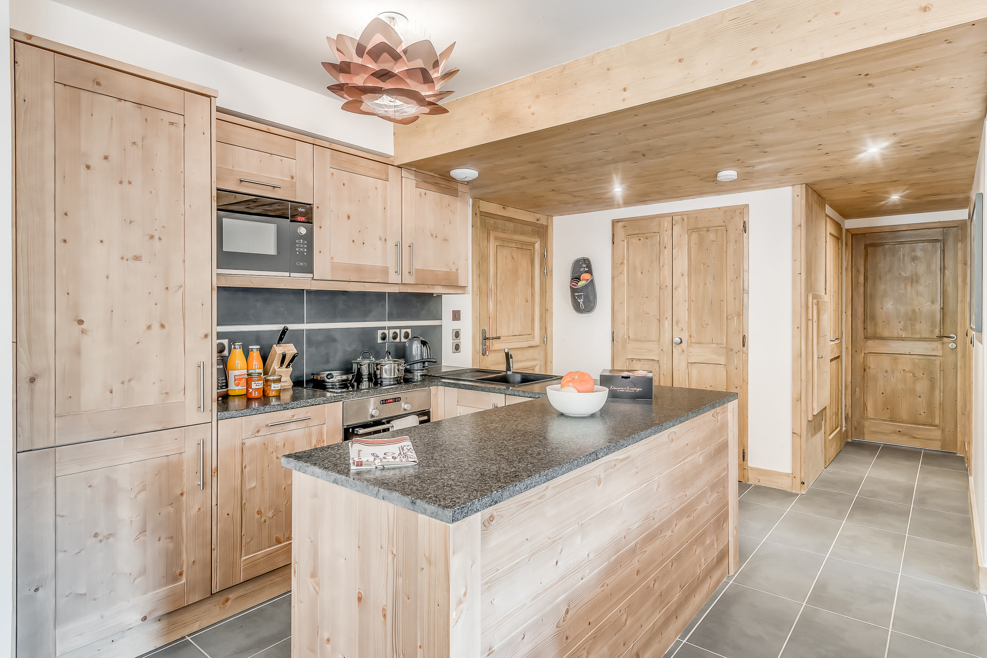 Cuisine completement equipee : refrigerateur avec partie congelation, four combine, lave-vaisselle, plaques vitroceramiques, cafetiere, machine a cafe Nespresso, bouilloire, grille-pain