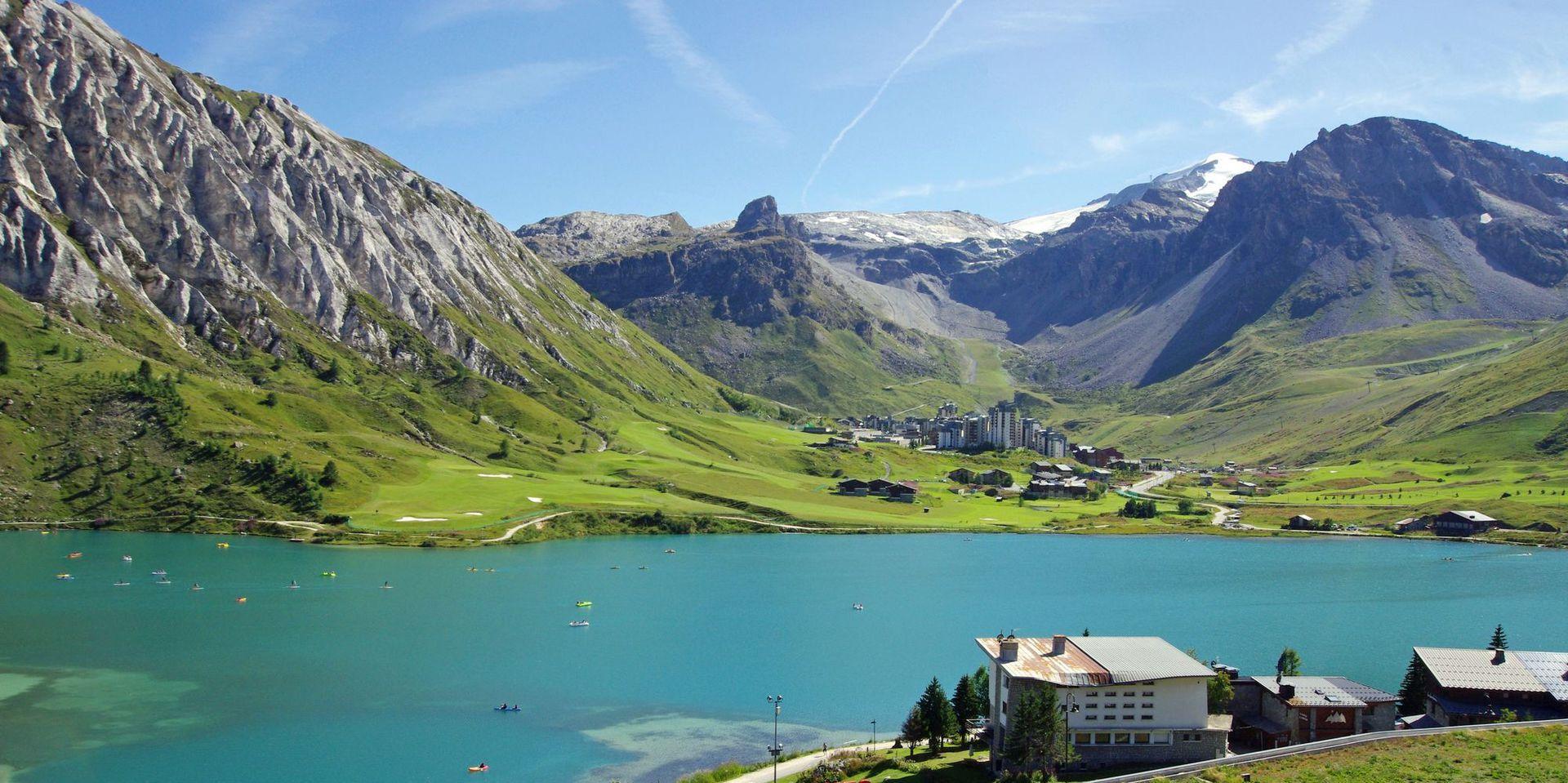 Balcon expose sud avec une vue sur le glacier de la Grande Motte et le lac naturel de Tignes.