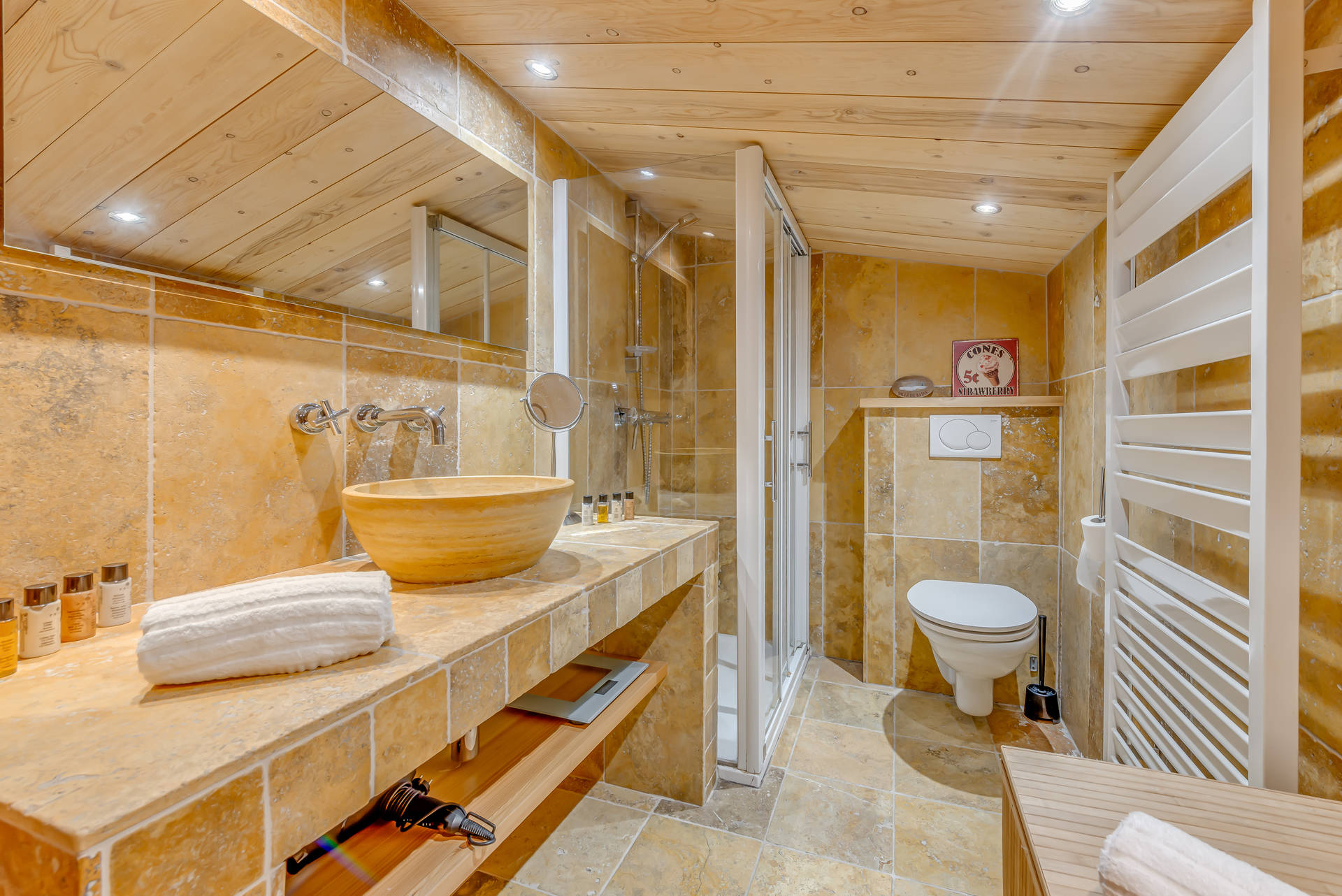 1 salle de bain attenante avec douche, WC, meuble vasque et radiateur seche serviettes