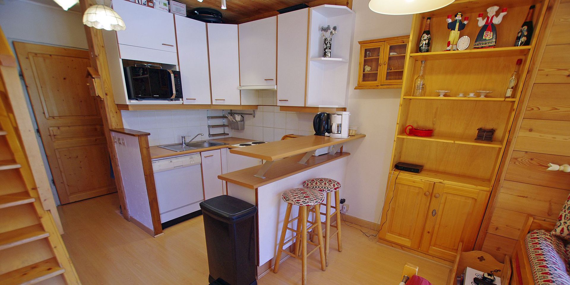 - Cuisine ouverte sur le sejour, avec bar passe plat, meubles de rangement.