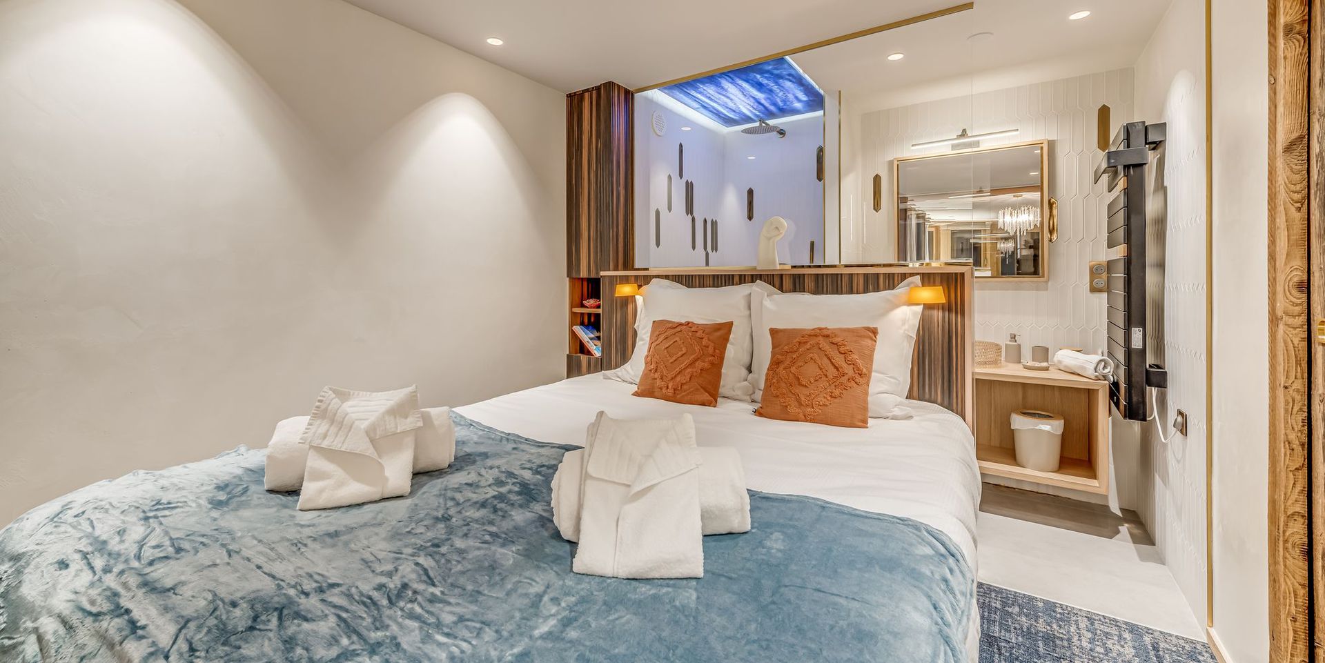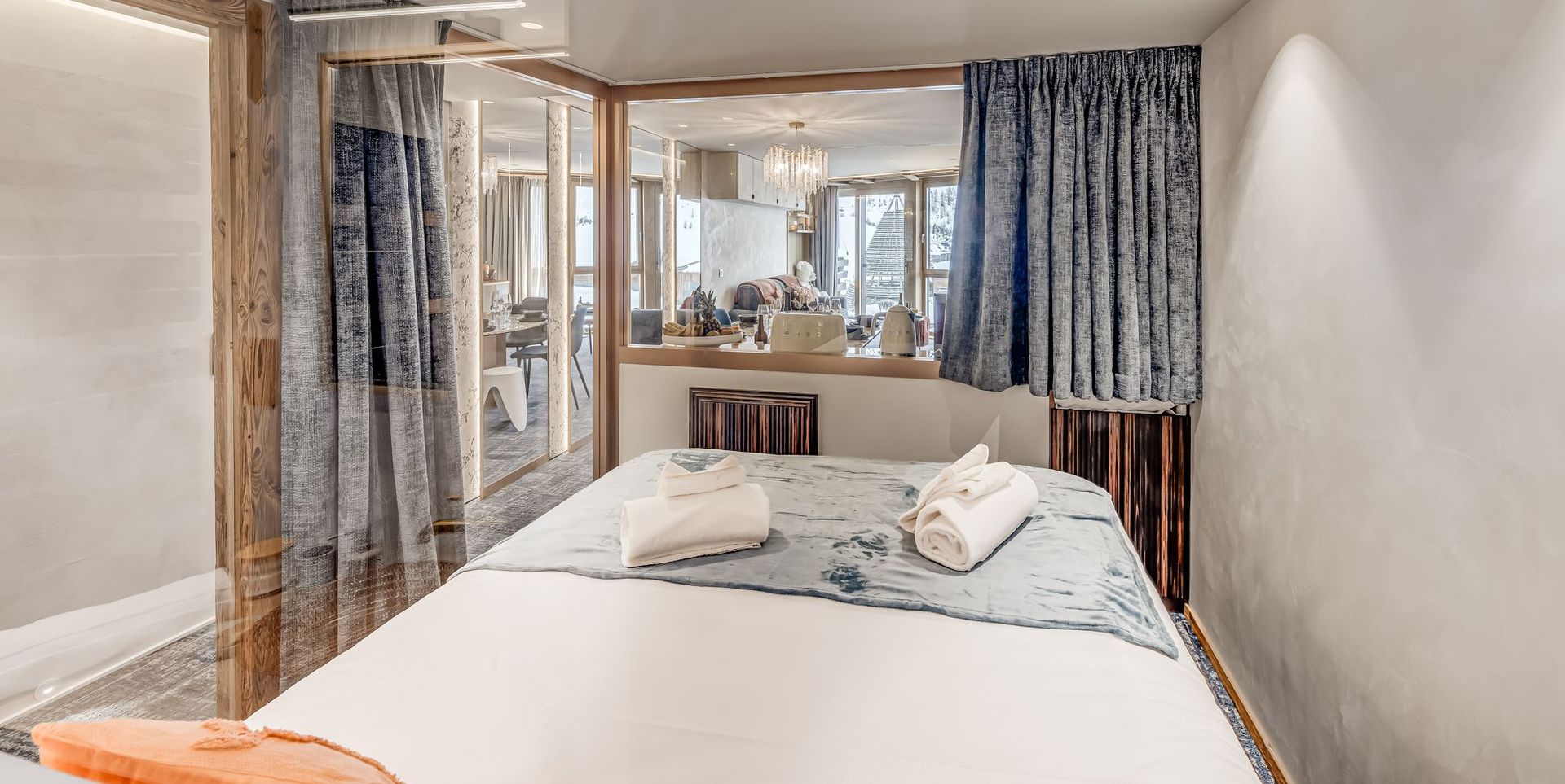1 Chambre MASTER en SUITE, avec lit-double (lit coffre), placards de rangement, salle de douche, meuble vasque, radiateur seche serviettes. La chambre est totalement vitree en direction du Lac, et beneficie en journee de la lumiere exterieure. Pendant la nuit, la chambre est occultee par des grands rideaux coulissants.