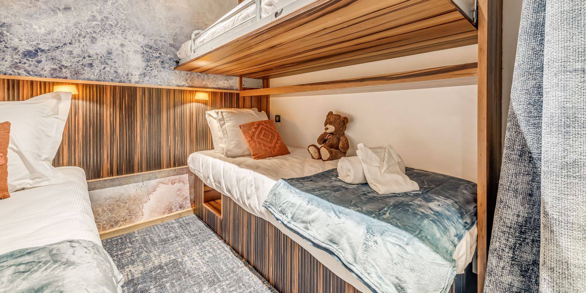 1 chambre - cabine, avec 2 lits simples au sols, rapprochables en lit couple. 1 lit superpose rabattable. 1 placard de rangement et 1 TV connectee. Fermeture de la chambre par cloison vitree coulissante. Rideau d'occultation. 1 salle de bains , avec douche a l'italienne, meuble vasque, radiateur seche-serviette, WC suspendu.